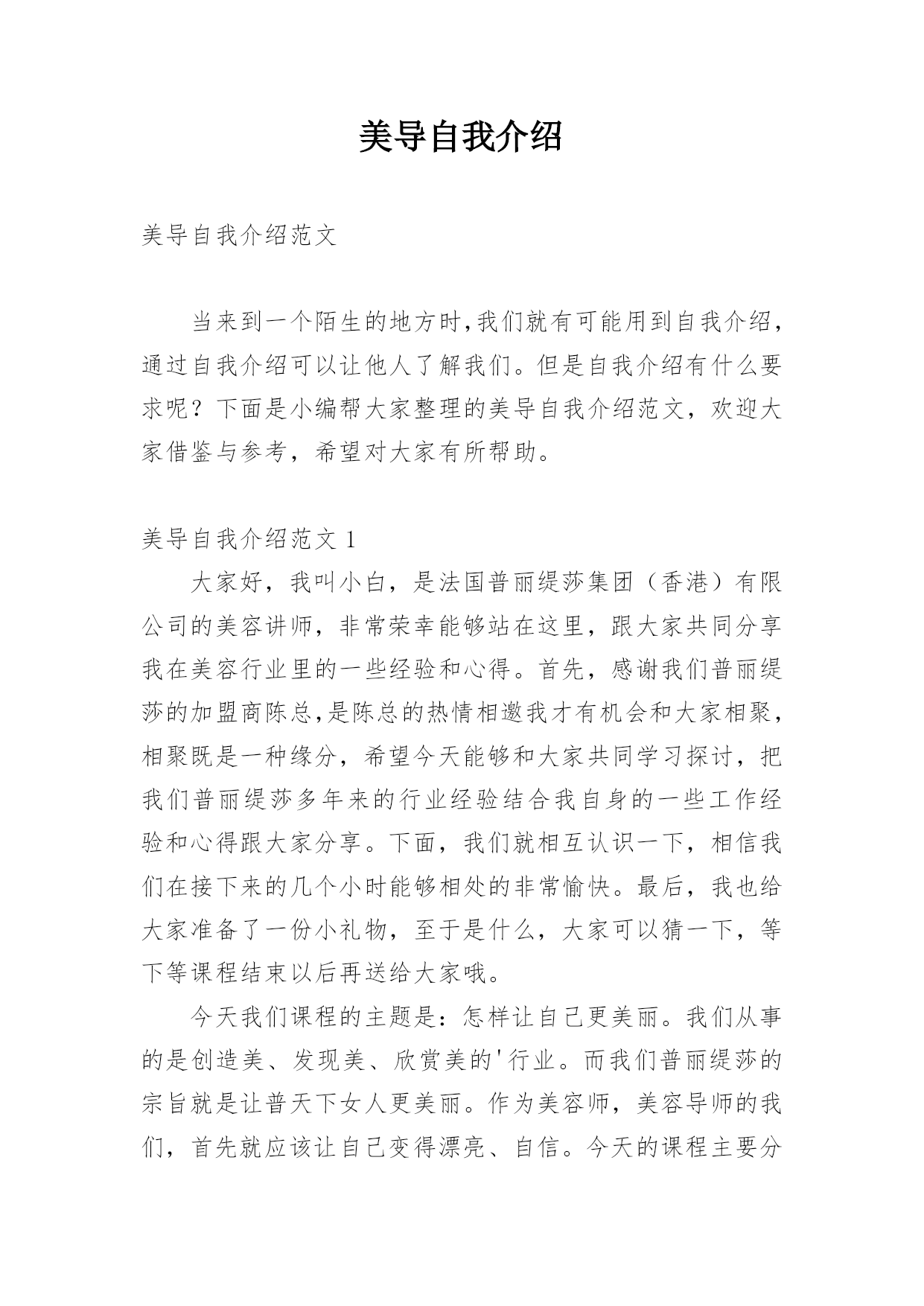 美导自我介绍美导自我介绍范文当来到一个陌生的地方时,我们就有可能用到自我介绍,通过自我介绍可以让他人了解我们。但是自我介绍有什么要求呢?下面是小编帮大家整理的美导自我介绍范文,欢迎大家借鉴与参考,希望对大家有所帮助。美导自我介绍范文1大家好,我叫小白,是法国普丽缇莎集团(香港)有限公司的美容讲师,非常荣幸能够站在这里,跟大家共同分享我在美容行业里的一些经验和心得。首先,感谢我们普丽缇莎的加盟商陈总,是陈总的热情相邀我才有机会和大家相聚,相聚既是一种缘分,希望今天能够和大家共同学习探讨,把我们普丽缇莎多年来