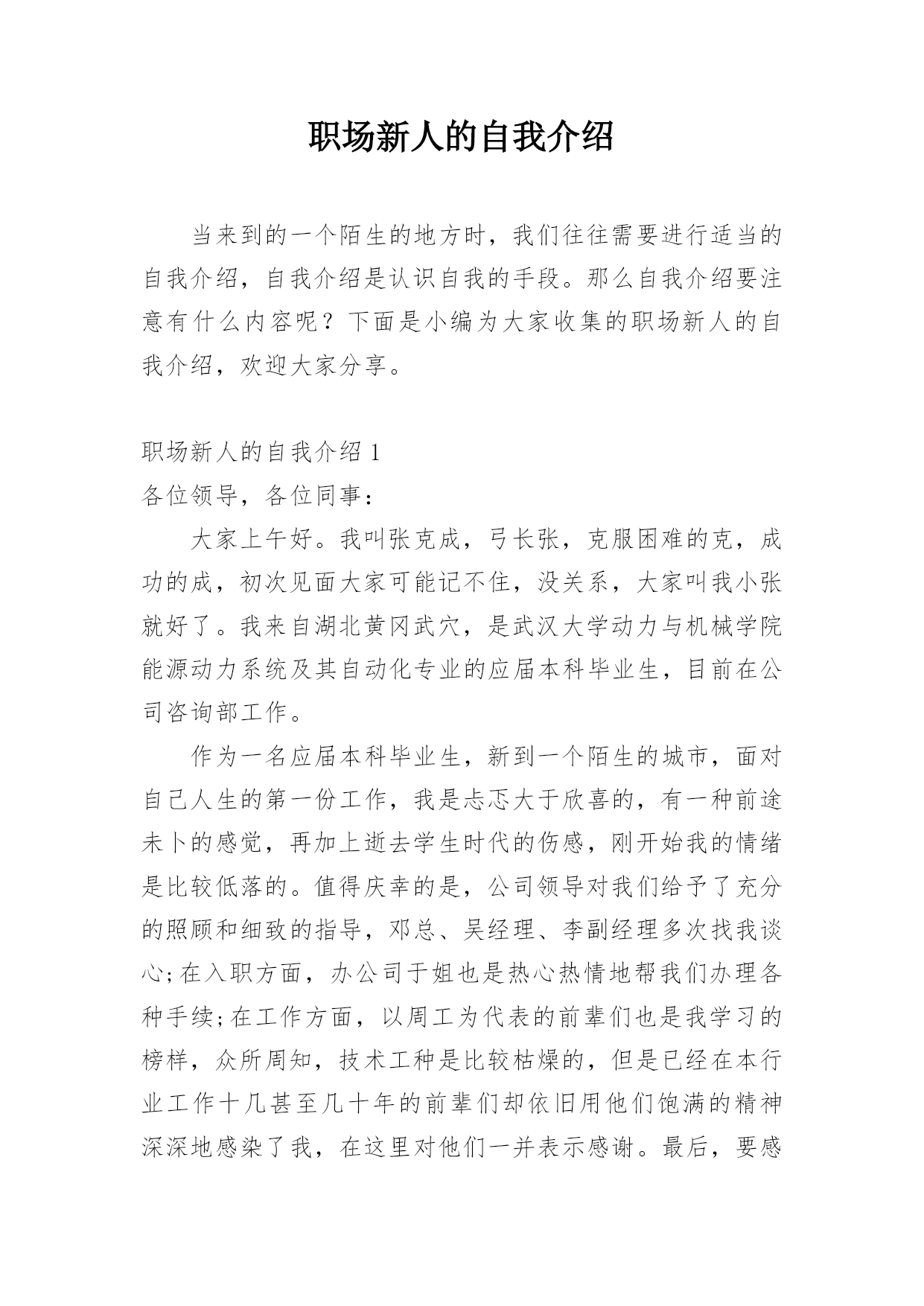 职场新人的自我介绍当来到的一个陌生的地方时,我们往往需要进行适当的自我介绍,自我介绍是认识自我的手段。那么自我介绍要注意有什么内容呢?下面是小编为大家收集的职场新人的自我介绍,欢迎大家分享。职场新人的自我介绍1各位领导,各位同事:大家上午好。我叫张克成,弓长张,克服困难的克,成功的成,初次见面大家可能记不住,没关系,大家叫我小张就好了。我来自湖北黄冈武穴,是武汉大学动力与机械学院能源动力系统及其自动化专业的应届本科毕业生,目前在公司咨询部工作。作为一名应届本科毕业生,新到一个陌生的城市,面对自己人生的第一