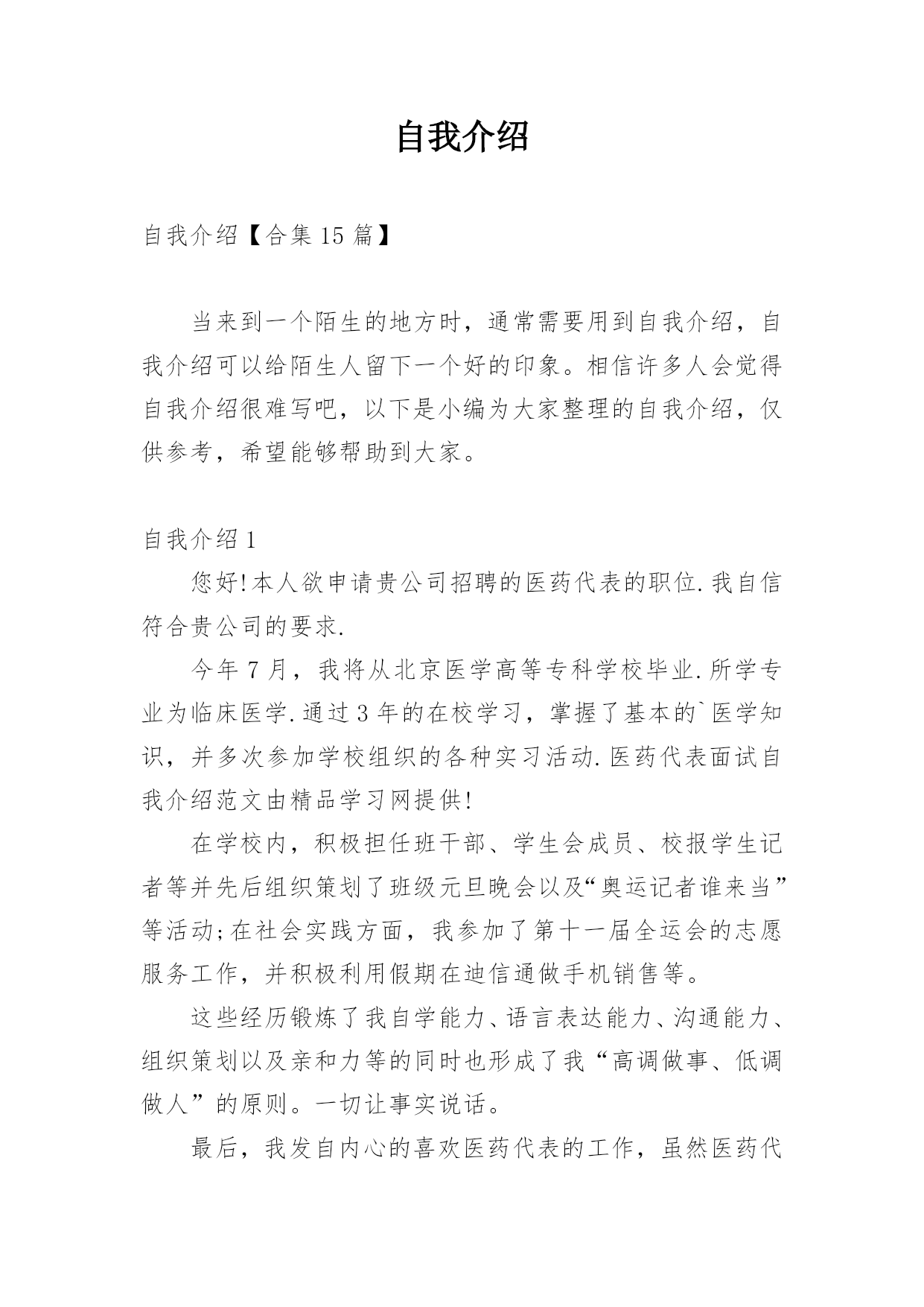自我介绍自我介绍【合集15篇】当来到一个陌生的地方时,通常需要用到自我介绍,自我介绍可以给陌生人留下一个好的印象。相信许多人会觉得自我介绍很难写吧,以下是小编为大家整理的自我介绍,仅供参考,希望能够帮助到大家。自我介绍1您好!本人欲申请贵公司招聘的医药代表的职位.我自信符合贵公司的要求.今年7月,我将从北京医学高等专科学校毕业.所学专业为临床医学.通过3年的在校学习,掌握了基本的`医学知识,并多次参加学校组织的各种实习活动.医药代表面试自我介绍范文由精品学习网提供!在学校内,积极担任班干部、学生会成员、校
