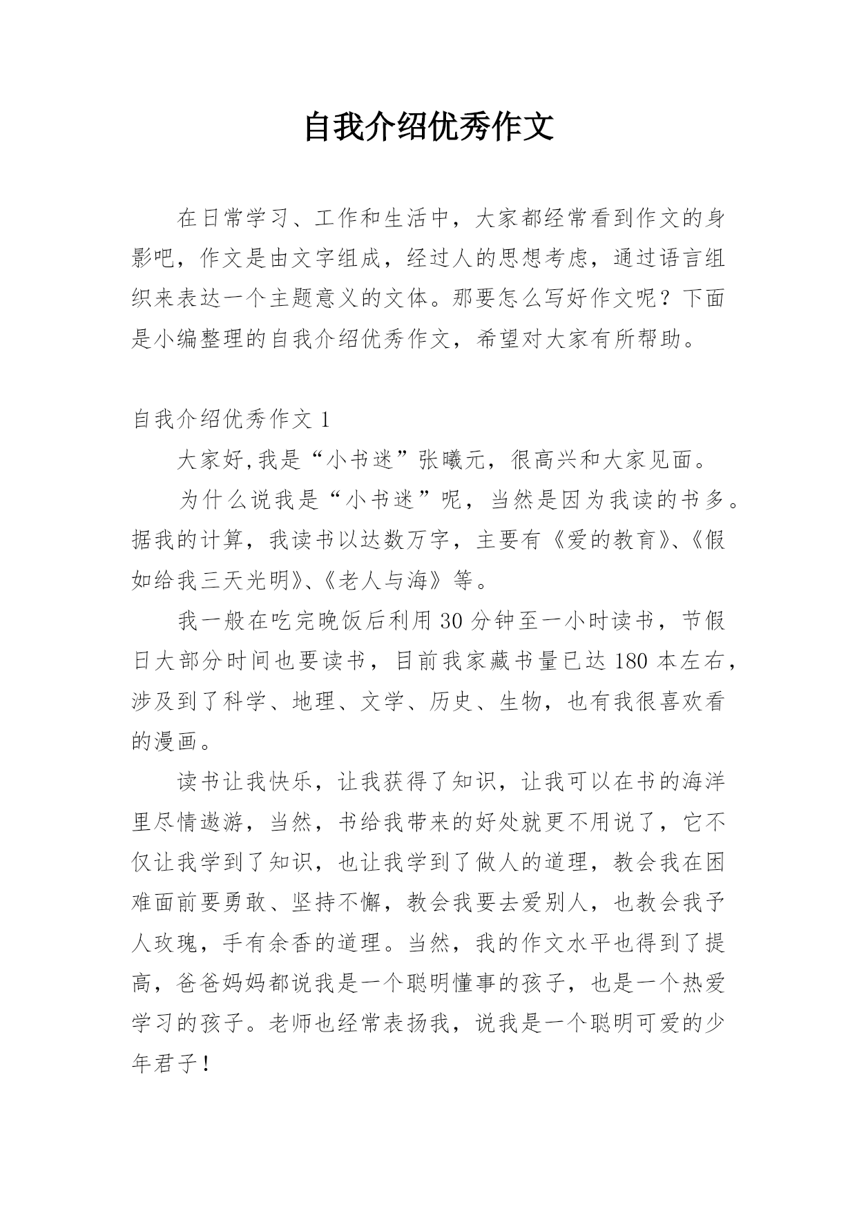 自我介绍优秀作文在日常学习、工作和生活中,大家都经常看到作文的身影吧,作文是由文字组成,经过人的思想考虑,通过语言组织来表达一个主题意义的文体。那要怎么写好作文呢?下面是小编整理的自我介绍优秀作文,希望对大家有所帮助。自我介绍优秀作文1大家好,我是“小书迷”张曦元,很高兴和大家见面。为什么说我是“小书迷”呢,当然是因为我读的书多。据我的计算,我读书以达数万字,主要有《爱的教育》、《假如给我三天光明》、《老人与海》等。我一般在吃完晚饭后利用30分钟至一小时读书,节假日大部分时间也要读书,目前我家藏书量已达1