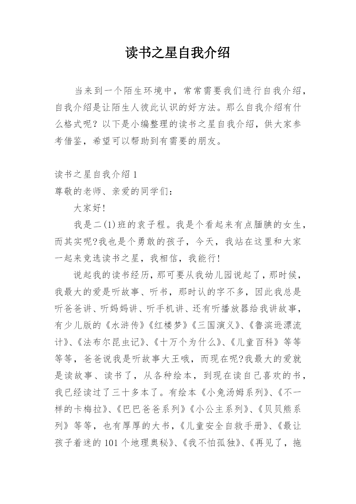读书之星自我介绍当来到一个陌生环境中,常常需要我们进行自我介绍,自我介绍是让陌生人彼此认识的好方法。那么自我介绍有什么格式呢?以下是小编整理的读书之星自我介绍,供大家参考借鉴,希望可以帮助到有需要的朋友。读书之星自我介绍1尊敬的老师、亲爱的同学们:大家好!我是二(1)班的袁子程。我是个看起来有点腼腆的女生,而其实呢?我也是个勇敢的孩子,今天,我站在这里和大家一起来竞选读书之星,我相信,我能行!说起我的读书经历,那可要从我幼儿园说起了,那时候,我最大的爱是听故事、听书,那时认的字不多,因此我总是听爸爸讲、听