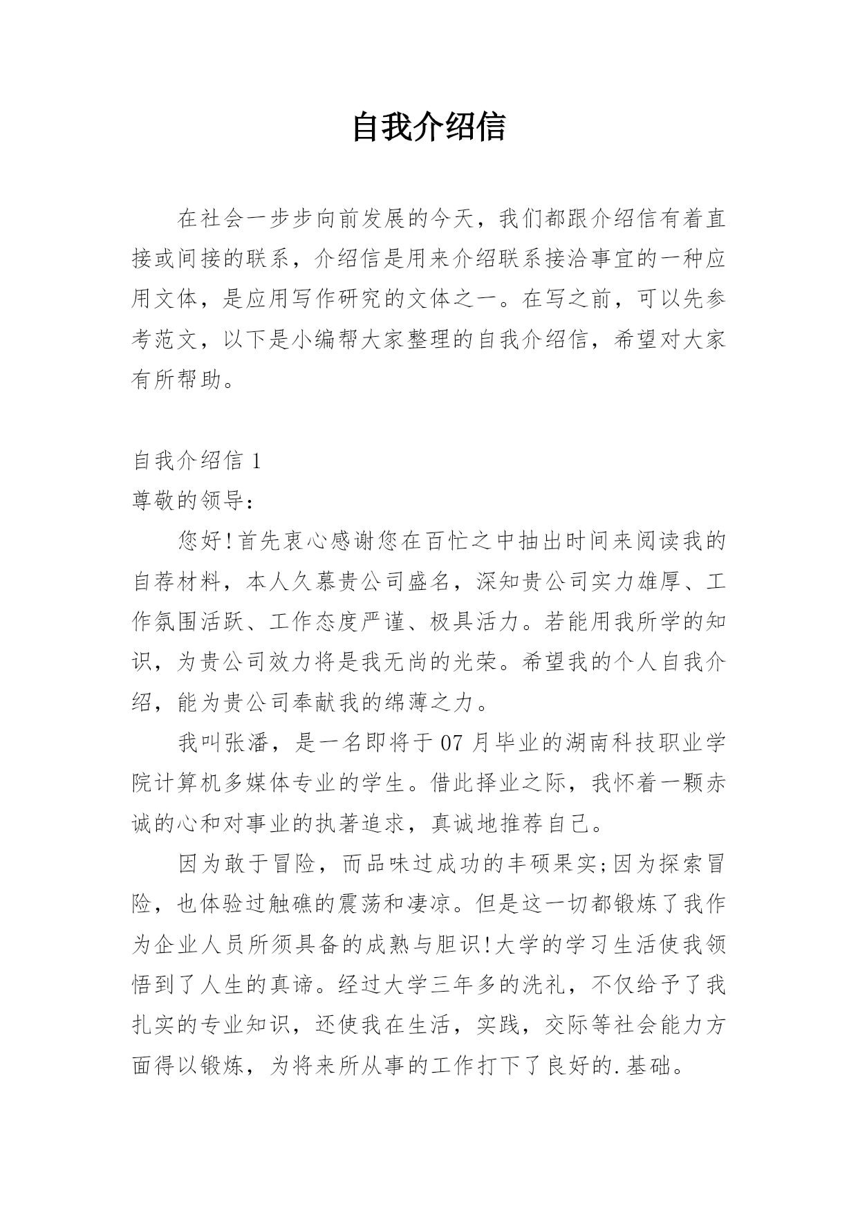 自我介绍信在社会一步步向前发展的今天,我们都跟介绍信有着直接或间接的联系,介绍信是用来介绍联系接洽事宜的一种应用文体,是应用写作研究的文体之一。在写之前,可以先参考范文,以下是小编帮大家整理的自我介绍信,希望对大家有所帮助。自我介绍信1尊敬的领导:您好!首先衷心感谢您在百忙之中抽出时间来阅读我的自荐材料,本人久慕贵公司盛名,深知贵公司实力雄厚、工作氛围活跃、工作态度严谨、极具活力。若能用我所学的知识,为贵公司效力将是我无尚的光荣。希望我的个人自我介绍,能为贵公司奉献我的绵薄之力。我叫张潘,是一名即将于07
