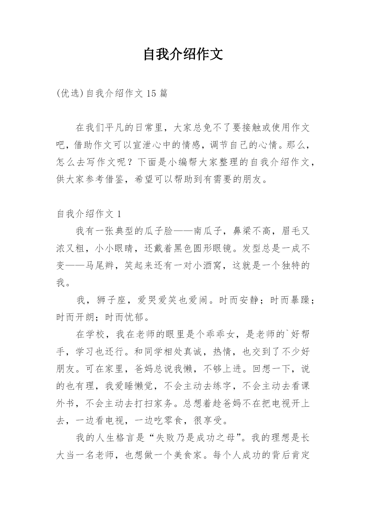 自我介绍作文(优选)自我介绍作文15篇在我们平凡的日常里,大家总免不了要接触或使用作文吧,借助作文可以宣泄心中的情感,调节自己的心情。那么,怎么去写作文呢?下面是小编帮大家整理的自我介绍作文,供大家参考借鉴,希望可以帮助到有需要的朋友。自我介绍作文1我有一张典型的瓜子脸——南瓜子,鼻梁不高,眉毛又浓又粗,小小眼睛,还戴着黑色圆形眼镜。发型总是一成不变——马尾辫,笑起来还有一对小酒窝,这就是一个独特的我。我,狮子座,爱哭爱笑也爱闹。时而安静;时而暴躁;时而开朗;时而忧郁。在学校,我在老师的眼里是个乖乖女,是