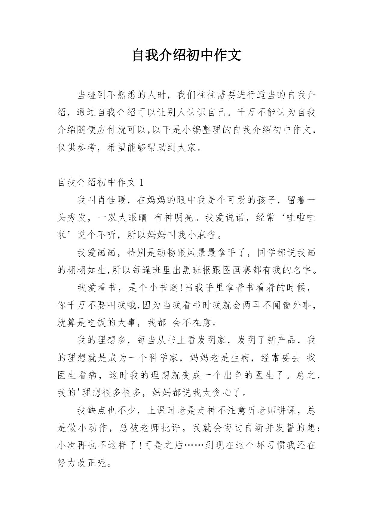 自我介绍初中作文当碰到不熟悉的人时,我们往往需要进行适当的自我介绍,通过自我介绍可以让别人认识自己。千万不能认为自我介绍随便应付就可以,以下是小编整理的自我介绍初中作文,仅供参考,希望能够帮助到大家。自我介绍初中作文1我叫肖佳暖,在妈妈的眼中我是个可爱的孩子,留着一头秀发,一双大眼睛有神明亮。我爱说话,经常‘哇啦哇啦’说个不听,所以妈妈叫我小麻雀。我爱画画,特别是动物跟风景最拿手了,同学都说我画的栩栩如生,所以每逢班里出黑班报跟图画赛都有我的名字。我爱看书,是个小书谜!当我手里拿着书看着的时候,你千万不要