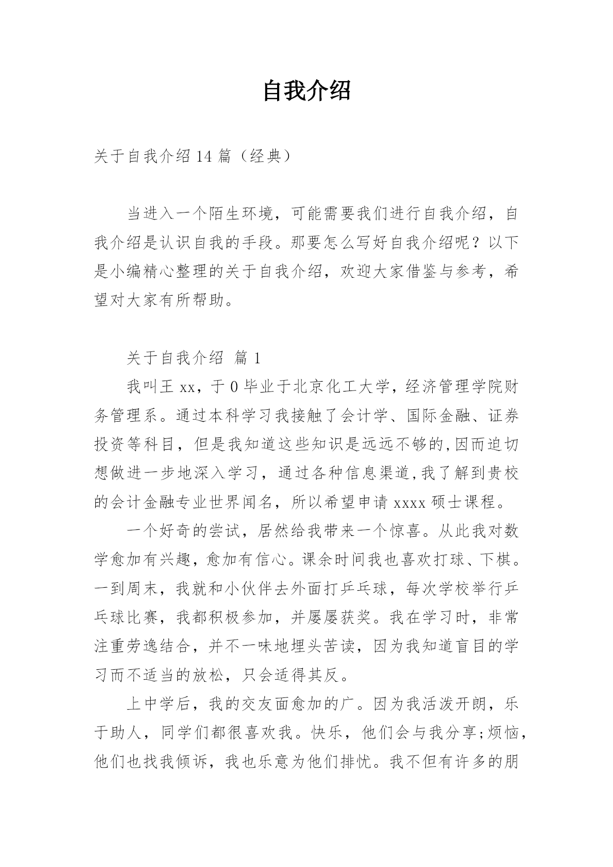 自我介绍关于自我介绍14篇(经典)当进入一个陌生环境,可能需要我们进行自我介绍,自我介绍是认识自我的手段。那要怎么写好自我介绍呢?以下是小编精心整理的关于自我介绍,欢迎大家借鉴与参考,希望对大家有所帮助。关于自我介绍篇1我叫王xx,于0毕业于北京化工大学,经济管理学院财务管理系。通过本科学习我接触了会计学、国际金融、证券投资等科目,但是我知道这些知识是远远不够的,因而迫切想做进一步地深入学习,通过各种信息渠道,我了解到贵校的会计金融专业世界闻名,所以希望申请xxxx硕士课程。一个好奇的尝试,居然给我带来一