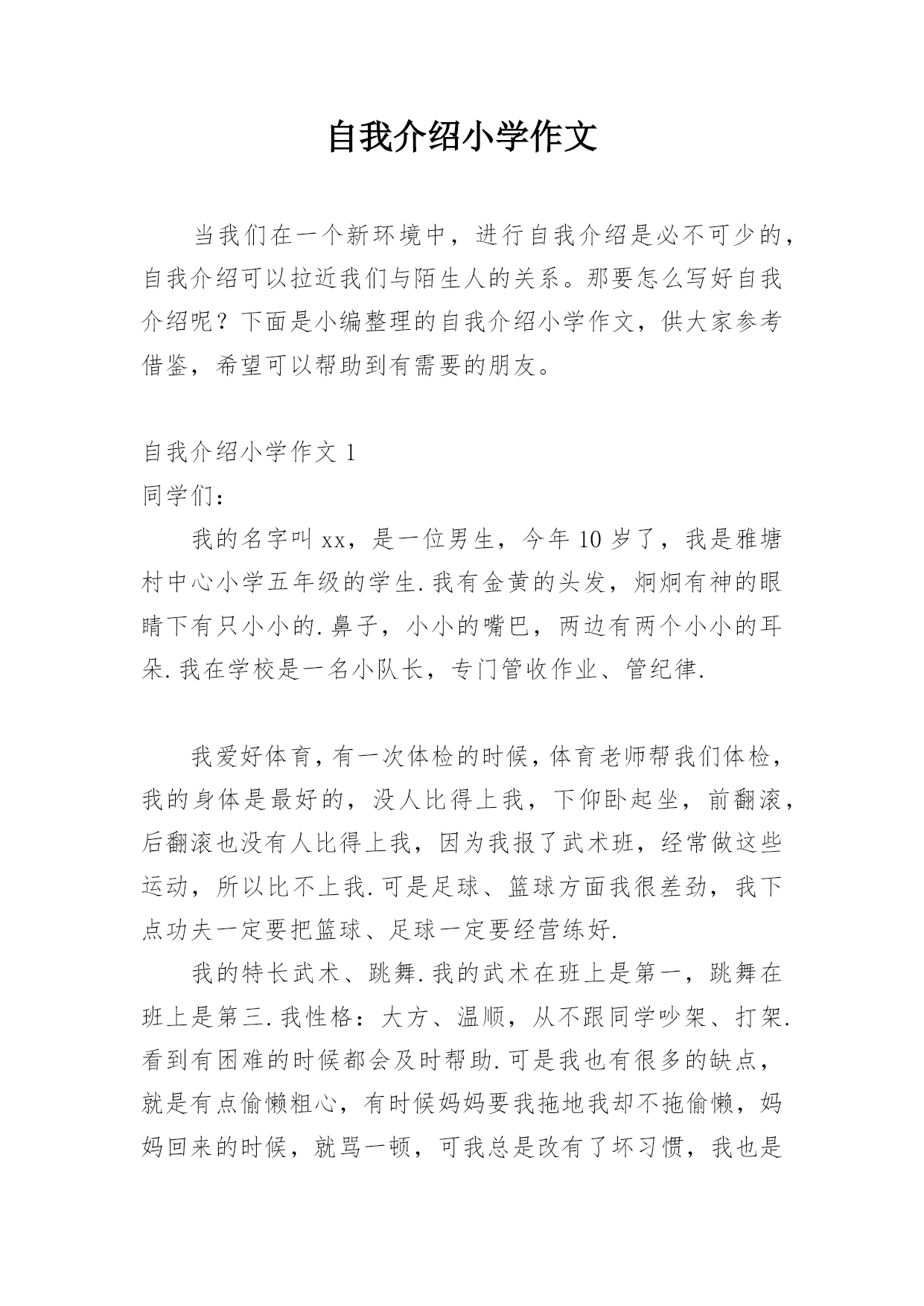 自我介绍小学作文当我们在一个新环境中,进行自我介绍是必不可少的,自我介绍可以拉近我们与陌生人的关系。那要怎么写好自我介绍呢?下面是小编整理的自我介绍小学作文,供大家参考借鉴,希望可以帮助到有需要的朋友。自我介绍小学作文1同学们:我的名字叫xx,是一位男生,今年10岁了,我是雅塘村中心小学五年级的学生.我有金黄的头发,炯炯有神的眼睛下有只小小的.鼻子,小小的嘴巴,两边有两个小小的耳朵.我在学校是一名小队长,专门管收作业、管纪律.我爱好体育,有一次体检的时候,体育老师帮我们体检,我的身体是最好的,没人比得上我