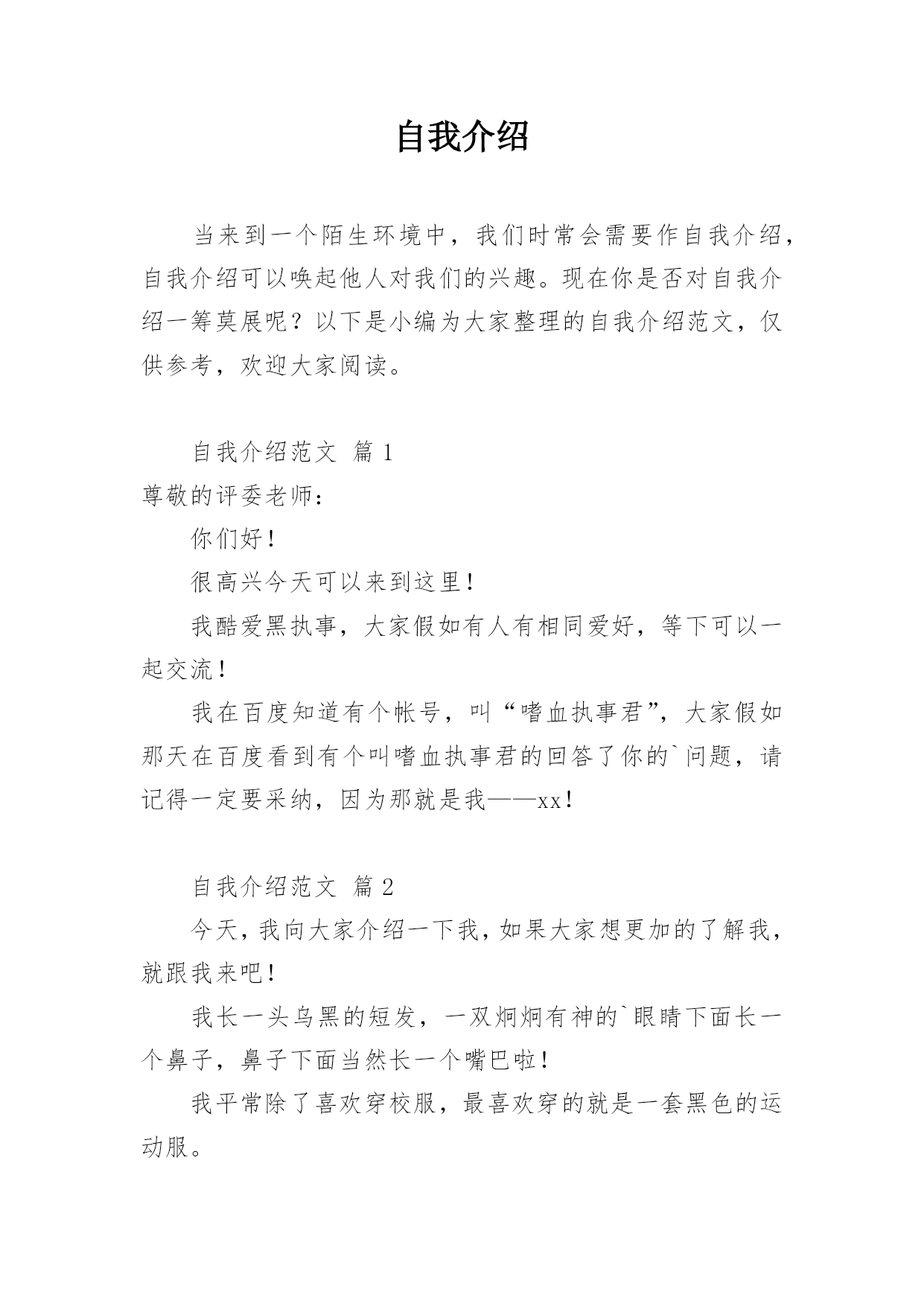 自我介绍当来到一个陌生环境中,我们时常会需要作自我介绍,自我介绍可以唤起他人对我们的兴趣。现在你是否对自我介绍一筹莫展呢?以下是小编为大家整理的自我介绍范文,仅供参考,欢迎大家阅读。自我介绍范文篇1尊敬的评委老师:你们好!很高兴今天可以来到这里!我酷爱黑执事,大家假如有人有相同爱好,等下可以一起交流!我在百度知道有个帐号,叫“嗜血执事君”,大家假如那天在百度看到有个叫嗜血执事君的回答了你的`问题,请记得一定要采纳,因为那就是我——xx!自我介绍范文篇2今天,我向大家介绍一下我,如果大家想更加的了解我,就跟