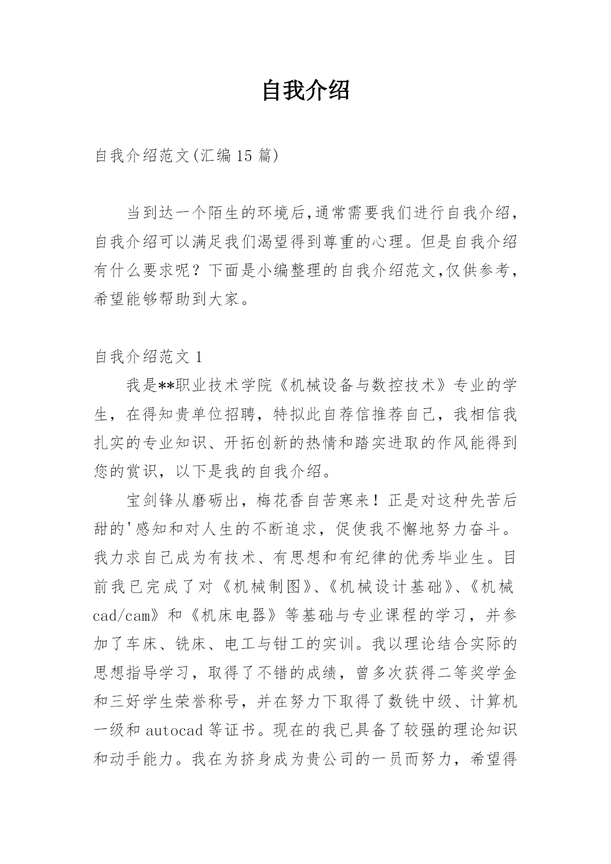 自我介绍自我介绍范文(汇编15篇)当到达一个陌生的环境后,通常需要我们进行自我介绍,自我介绍可以满足我们渴望得到尊重的心理。但是自我介绍有什么要求呢?下面是小编整理的自我介绍范文,仅供参考,希望能够帮助到大家。自我介绍范文1我是**职业技术学院《机械设备与数控技术》专业的学生,在得知贵单位招聘,特拟此自荐信推荐自己,我相信我扎实的专业知识、开拓创新的热情和踏实进取的作风能得到您的赏识,以下是我的自我介绍。宝剑锋从磨砺出,梅花香自苦寒来!正是对这种先苦后甜的'感知和对人生的不断追求,促使我不懈地努力奋斗。我