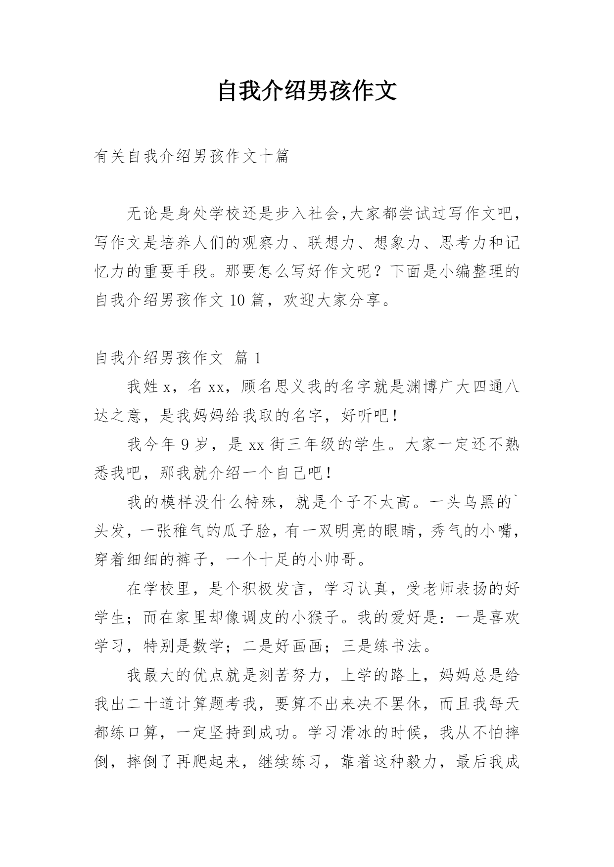 自我介绍男孩作文有关自我介绍男孩作文十篇无论是身处学校还是步入社会,大家都尝试过写作文吧,写作文是培养人们的观察力、联想力、想象力、思考力和记忆力的重要手段。那要怎么写好作文呢?下面是小编整理的自我介绍男孩作文10篇,欢迎大家分享。自我介绍男孩作文篇1我姓x,名xx,顾名思义我的名字就是渊博广大四通八达之意,是我妈妈给我取的名字,好听吧!我今年9岁,是xx街三年级的学生。大家一定还不熟悉我吧,那我就介绍一个自己吧!我的模样没什么特殊,就是个子不太高。一头乌黑的`头发,一张稚气的瓜子脸,有一双明亮的眼睛,秀