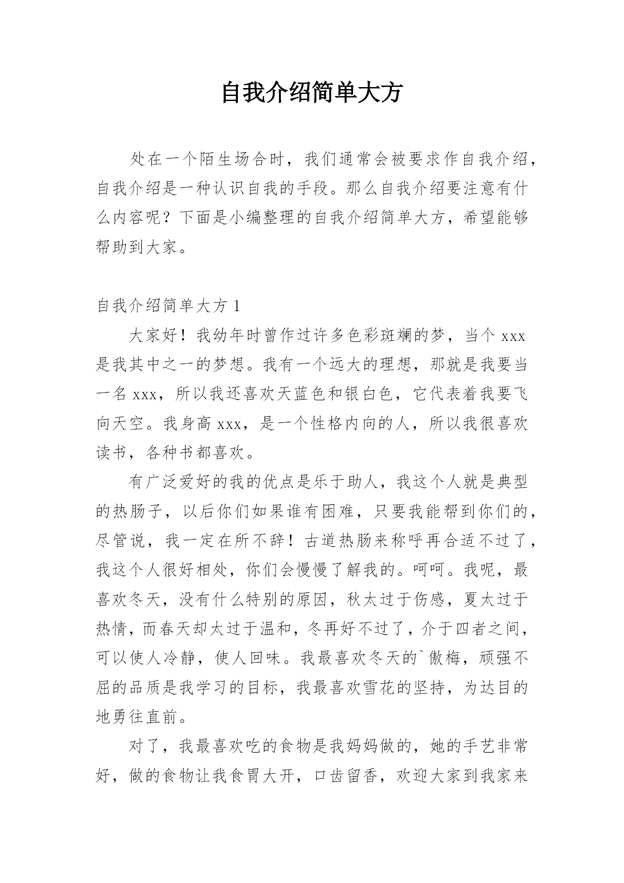 自我介绍简单大方处在一个陌生场合时,我们通常会被要求作自我介绍,自我介绍是一种认识自我的手段。那么自我介绍要注意有什么内容呢?下面是小编整理的自我介绍简单大方,希望能够帮助到大家。自我介绍简单大方1大家好!我幼年时曾作过许多色彩斑斓的梦,当个xxx是我其中之一的梦想。我有一个远大的理想,那就是我要当一名xxx,所以我还喜欢天蓝色和银白色,它代表着我要飞向天空。我身高xxx,是一个性格内向的人,所以我很喜欢读书,各种书都喜欢。有广泛爱好的我的优点是乐于助人,我这个人就是典型的热肠子,以后你们如果谁有困难,只