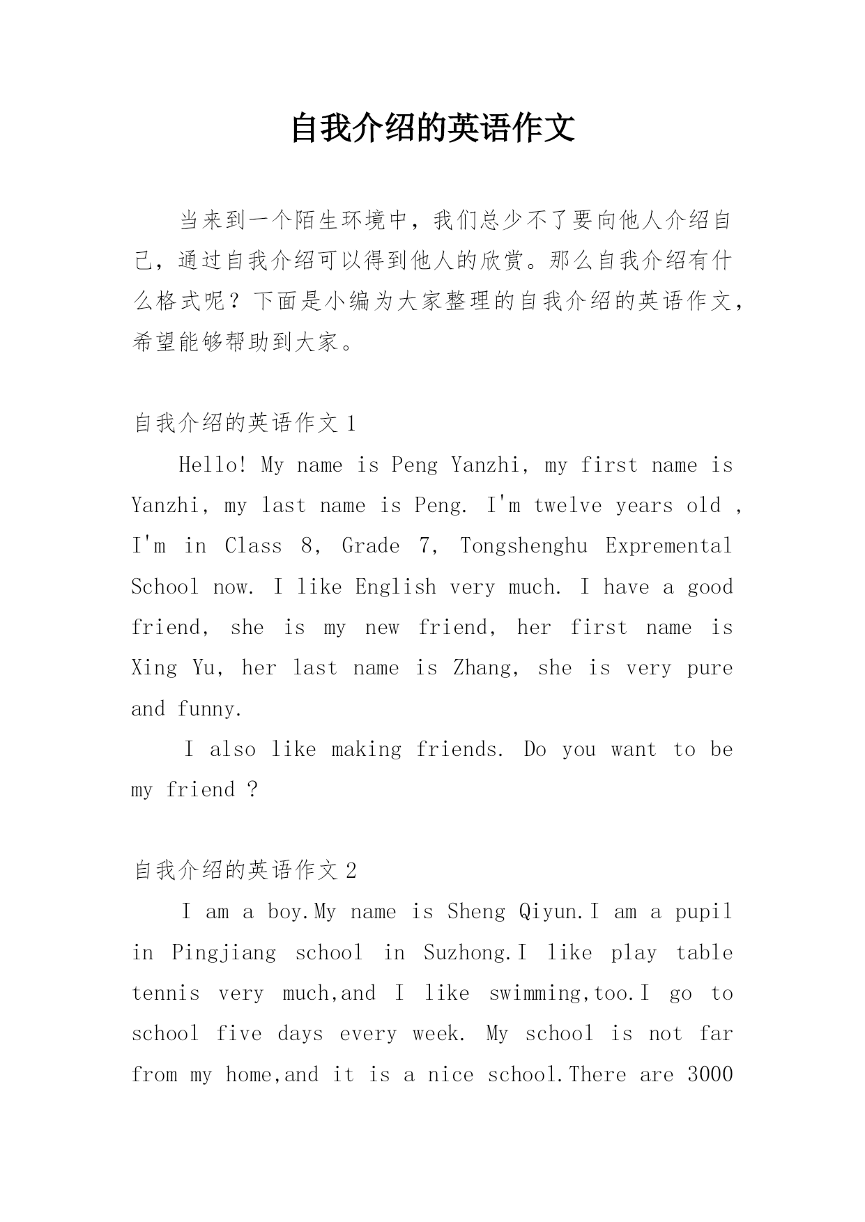 自我介绍的英语作文当来到一个陌生环境中,我们总少不了要向他人介绍自己,通过自我介绍可以得到他人的欣赏。那么自我介绍有什么格式呢?下面是小编为大家整理的自我介绍的英语作文,希望能够帮助到大家。自我介绍的英语作文1Hello!MynameisPengYanzhi,myfirstnameisYanzhi,mylastnameisPeng.I'mtwelveyearsold,I'minClass8,Grade7,TongshenghuExprementalSchoolnow.IlikeEnglishverymuc