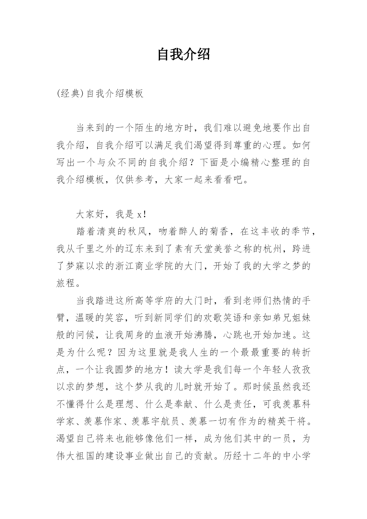 自我介绍(经典)自我介绍模板当来到的一个陌生的地方时,我们难以避免地要作出自我介绍,自我介绍可以满足我们渴望得到尊重的心理。如何写出一个与众不同的自我介绍?下面是小编精心整理的自我介绍模板,仅供参考,大家一起来看看吧。大家好,我是x!踏着清爽的秋风,吻着醉人的菊香,在这丰收的季节,我从千里之外的辽东来到了素有天堂美誉之称的杭州,跨进了梦寐以求的浙江商业学院的大门,开始了我的大学之梦的旅程。当我踏进这所高等学府的大门时,看到老师们热情的手臂,温暖的笑容,听到新同学们的欢歌笑语和亲如弟兄姐妹般的问候,让我周身
