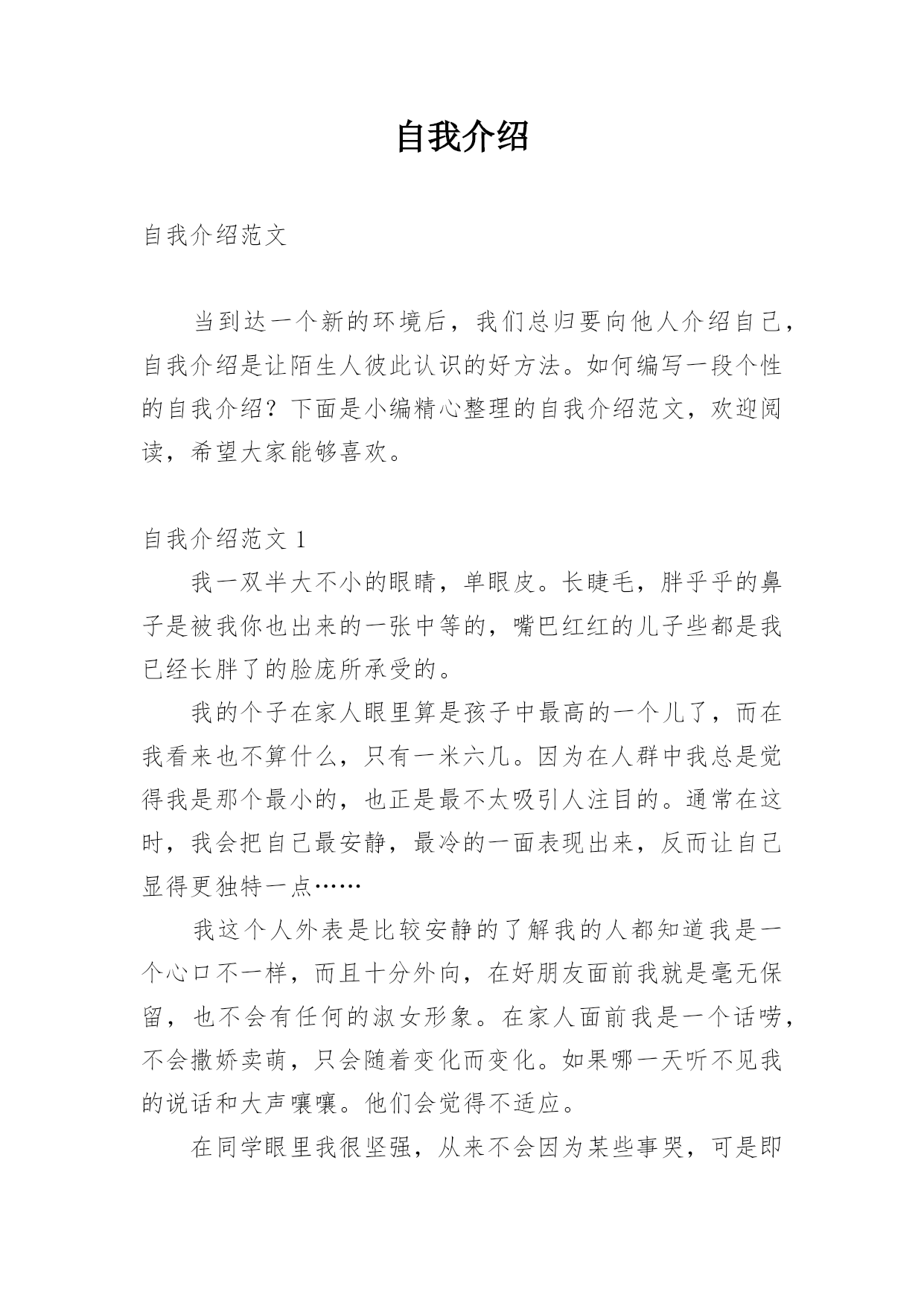 自我介绍自我介绍范文当到达一个新的环境后,我们总归要向他人介绍自己,自我介绍是让陌生人彼此认识的好方法。如何编写一段个性的自我介绍?下面是小编精心整理的自我介绍范文,欢迎阅读,希望大家能够喜欢。自我介绍范文1我一双半大不小的眼睛,单眼皮。长睫毛,胖乎乎的鼻子是被我你也出来的一张中等的,嘴巴红红的儿子些都是我已经长胖了的脸庞所承受的。我的个子在家人眼里算是孩子中最高的一个儿了,而在我看来也不算什么,只有一米六几。因为在人群中我总是觉得我是那个最小的,也正是最不太吸引人注目的。通常在这时,我会把自己最安静,最