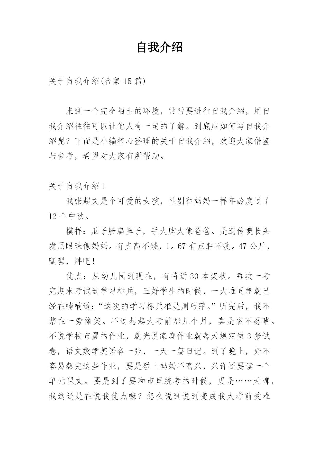 自我介绍关于自我介绍(合集15篇)来到一个完全陌生的环境,常常要进行自我介绍,用自我介绍往往可以让他人有一定的了解。到底应如何写自我介绍呢?下面是小编精心整理的关于自我介绍,欢迎大家借鉴与参考,希望对大家有所帮助。关于自我介绍1我张超文是个可爱的女孩,性别和妈妈一样年龄度过了12个中秋。模样:瓜子脸扁鼻子,手大脚大像爸爸。是遗传噢长头发黑眼珠像妈妈。有点高不矮,1。67有点胖不瘦。47公斤,嘿嘿,胖吧!优点:从幼儿园到现在,有将近30本奖状。每次一考完期末考试选学习标兵,三好学生的时候,一大堆同学就已经在