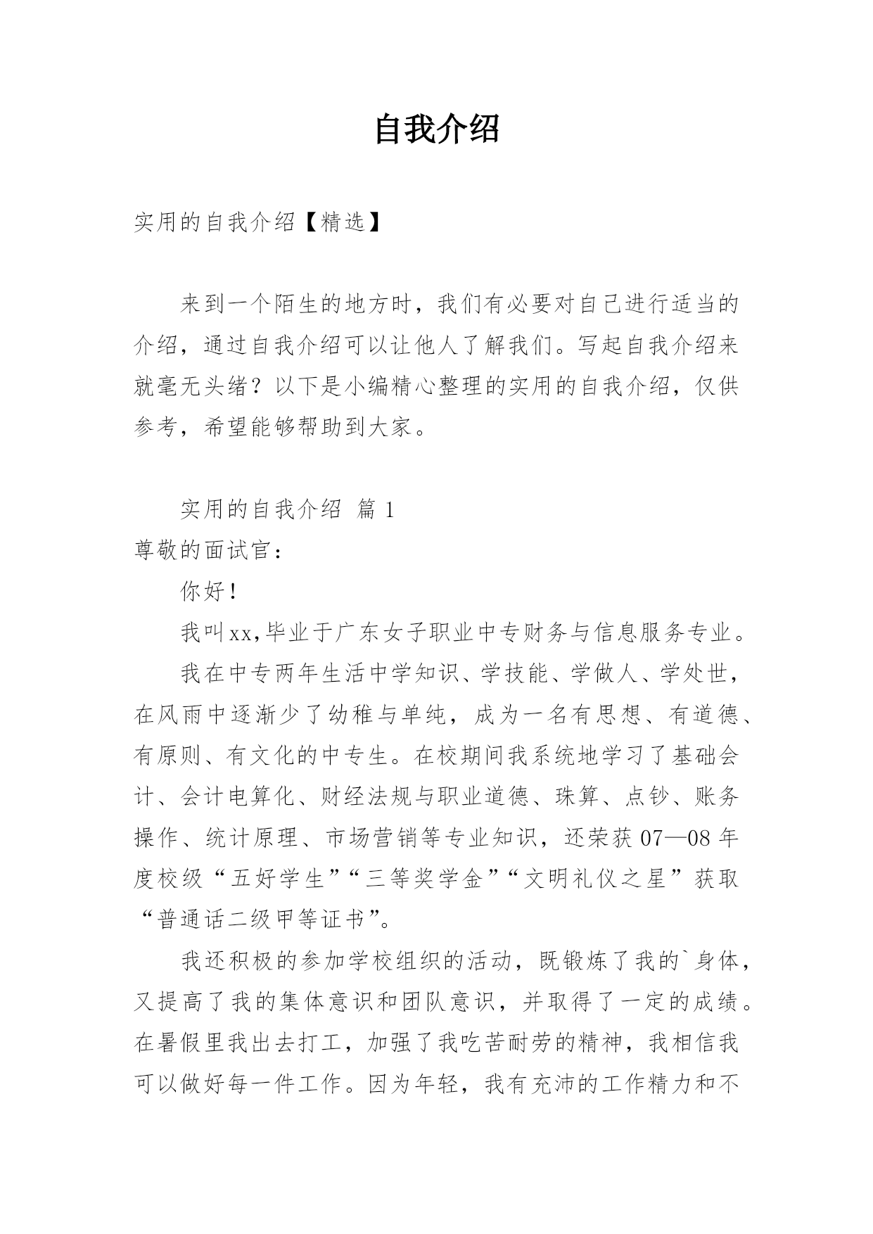 自我介绍实用的自我介绍【精选】来到一个陌生的地方时,我们有必要对自己进行适当的介绍,通过自我介绍可以让他人了解我们。写起自我介绍来就毫无头绪?以下是小编精心整理的实用的自我介绍,仅供参考,希望能够帮助到大家。实用的自我介绍篇1尊敬的面试官:你好!我叫xx,毕业于广东女子职业中专财务与信息服务专业。我在中专两年生活中学知识、学技能、学做人、学处世,在风雨中逐渐少了幼稚与单纯,成为一名有思想、有道德、有原则、有文化的中专生。在校期间我系统地学习了基础会计、会计电算化、财经法规与职业道德、珠算、点钞、账务操作、