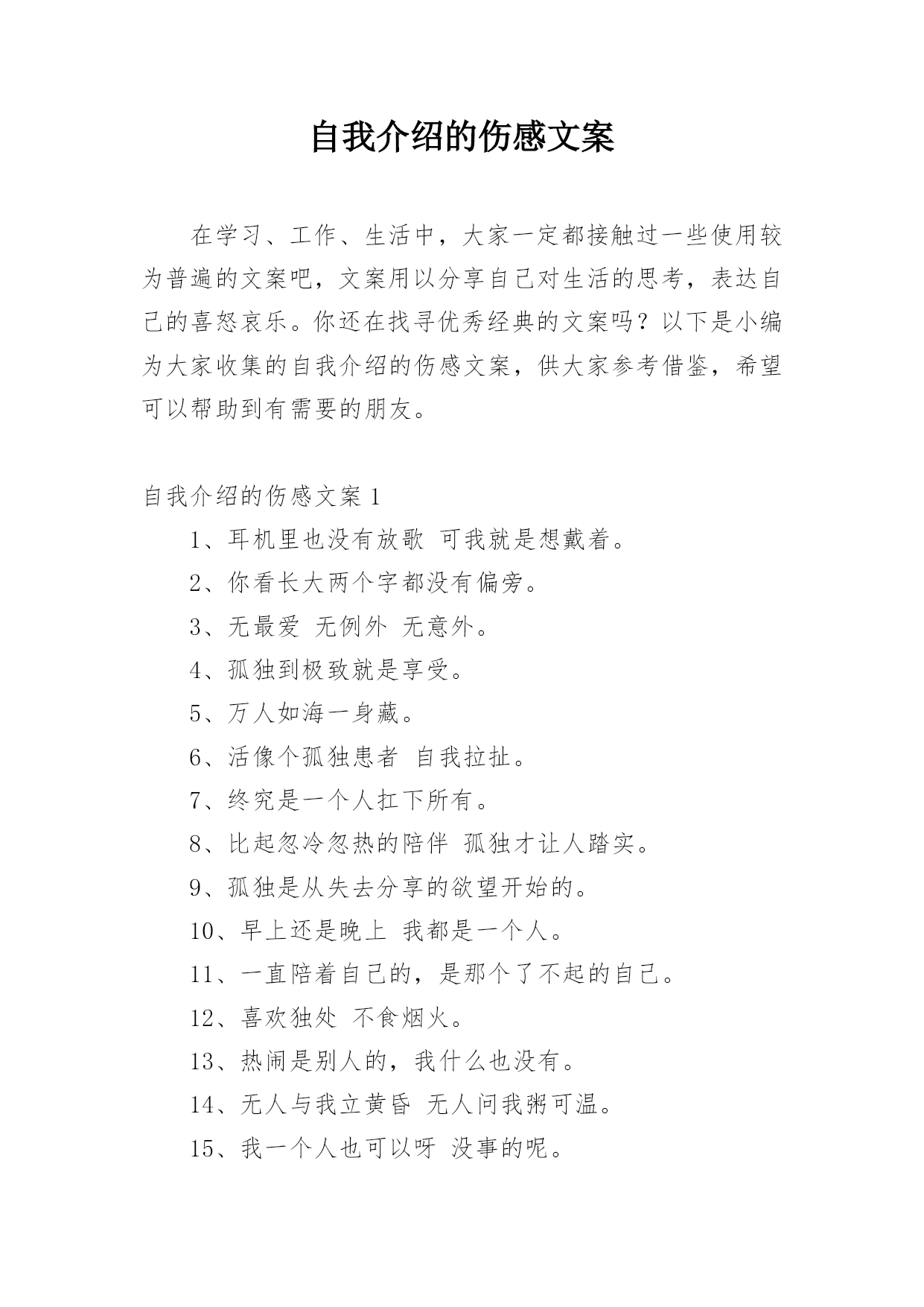 自我介绍的伤感文案在学习、工作、生活中,大家一定都接触过一些使用较为普遍的文案吧,文案用以分享自己对生活的思考,表达自己的喜怒哀乐。你还在找寻优秀经典的文案吗?以下是小编为大家收集的自我介绍的伤感文案,供大家参考借鉴,希望可以帮助到有需要的朋友。自我介绍的伤感文案11、耳机里也没有放歌可我就是想戴着。2、你看长大两个字都没有偏旁。3、无最爱无例外无意外。4、孤独到极致就是享受。5、万人如海一身藏。6、活像个孤独患者自我拉扯。7、终究是一个人扛下所有。8、比起忽冷忽热的陪伴孤独才让人踏实。9、孤独是从失去分