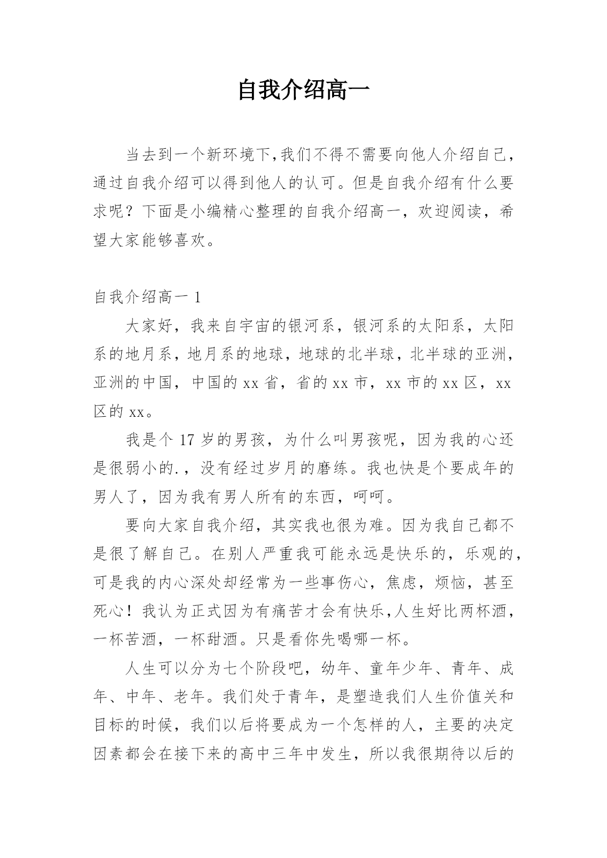 自我介绍高一当去到一个新环境下,我们不得不需要向他人介绍自己,通过自我介绍可以得到他人的认可。但是自我介绍有什么要求呢?下面是小编精心整理的自我介绍高一,欢迎阅读,希望大家能够喜欢。自我介绍高一1大家好,我来自宇宙的银河系,银河系的太阳系,太阳系的地月系,地月系的地球,地球的北半球,北半球的亚洲,亚洲的中国,中国的xx省,省的xx市,xx市的xx区,xx区的xx。我是个17岁的男孩,为什么叫男孩呢,因为我的心还是很弱小的.,没有经过岁月的磨练。我也快是个要成年的男人了,因为我有男人所有的东西,呵呵。要向大