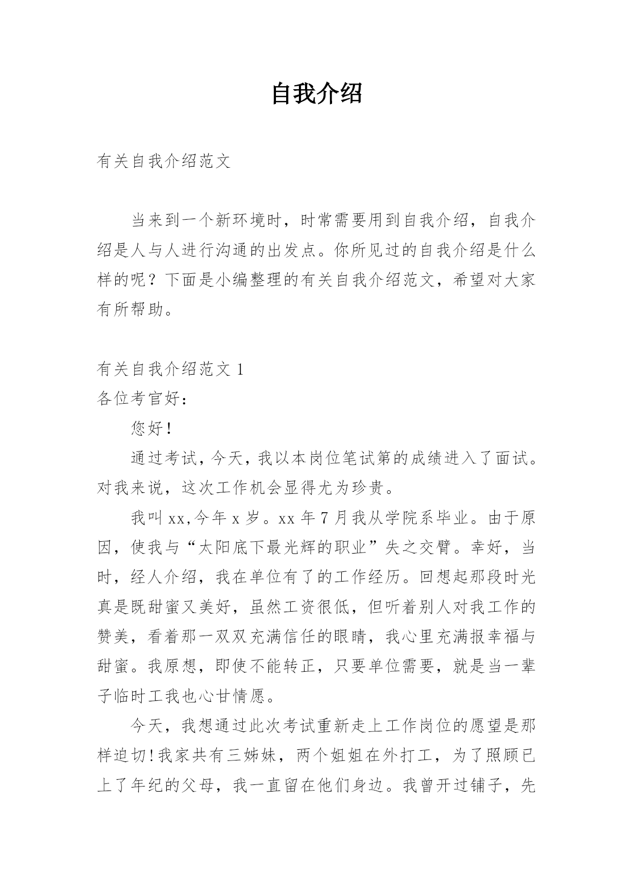 自我介绍有关自我介绍范文当来到一个新环境时,时常需要用到自我介绍,自我介绍是人与人进行沟通的出发点。你所见过的自我介绍是什么样的呢?下面是小编整理的有关自我介绍范文,希望对大家有所帮助。有关自我介绍范文1各位考官好:您好!通过考试,今天,我以本岗位笔试第的成绩进入了面试。对我来说,这次工作机会显得尤为珍贵。我叫xx,今年x岁。xx年7月我从学院系毕业。由于原因,使我与“太阳底下最光辉的职业”失之交臂。幸好,当时,经人介绍,我在单位有了的工作经历。回想起那段时光真是既甜蜜又美好,虽然工资很低,但听着别人对我