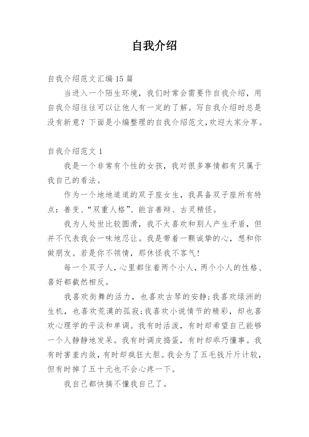 自我介绍自我介绍范文汇编15篇当进入一个陌生环境,我们时常会需要作自我介绍,用自我介绍往往可以让他人有一定的了解。写自我介绍时总是没有新意?下面是小编整理的自我介绍范文,欢迎大家分享。自我介绍范文1我是一个非常有个性的女孩,我对很多事情都有只属于我自己的看法。作为一个地地道道的双子座女生,我具备双子座所有特点:善变、“双重人格”、能言善辩、古灵精怪。我为人处世比较圆滑,我不太喜欢和别人产生矛盾,但并不代表我会一味地忍让。我是带着一颗诚挚的心,想和你做朋友。若是你不领情,那休怪我不客气!每一个双子人,心里都