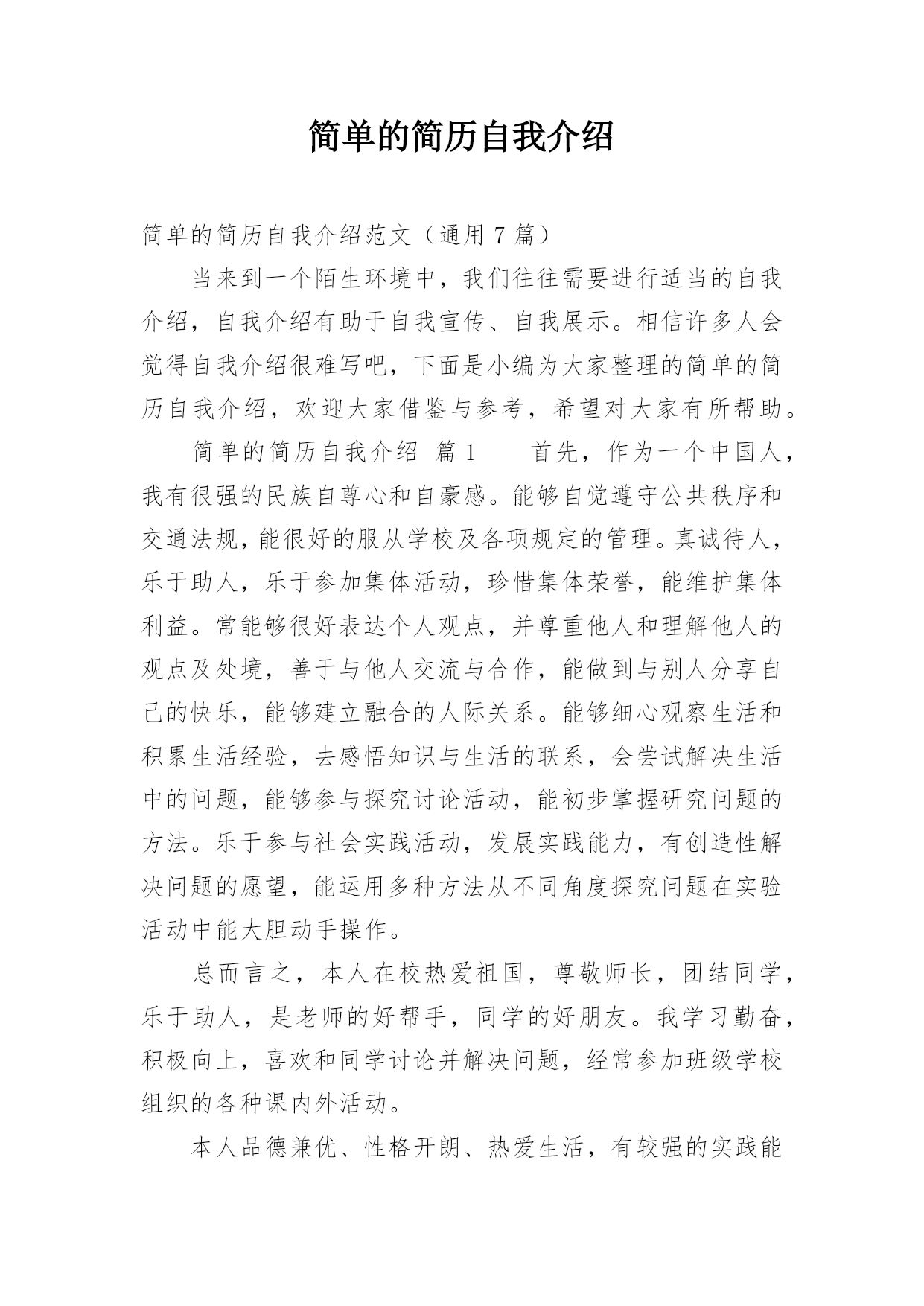 简单的简历自我介绍简单的简历自我介绍范文(通用7篇)当来到一个陌生环境中,我们往往需要进行适当的自我介绍,自我介绍有助于自我宣传、自我展示。相信许多人会觉得自我介绍很难写吧,下面是小编为大家整理的简单的简历自我介绍,欢迎大家借鉴与参考,希望对大家有所帮助。简单的简历自我介绍篇1首先,作为一个中国人,我有很强的民族自尊心和自豪感。能够自觉遵守公共秩序和交通法规,能很好的服从学校及各项规定的管理。真诚待人,乐于助人,乐于参加集体活动,珍惜集体荣誉,能维护集体利益。常能够很好表达个人观点,并尊重他人和理解他人的
