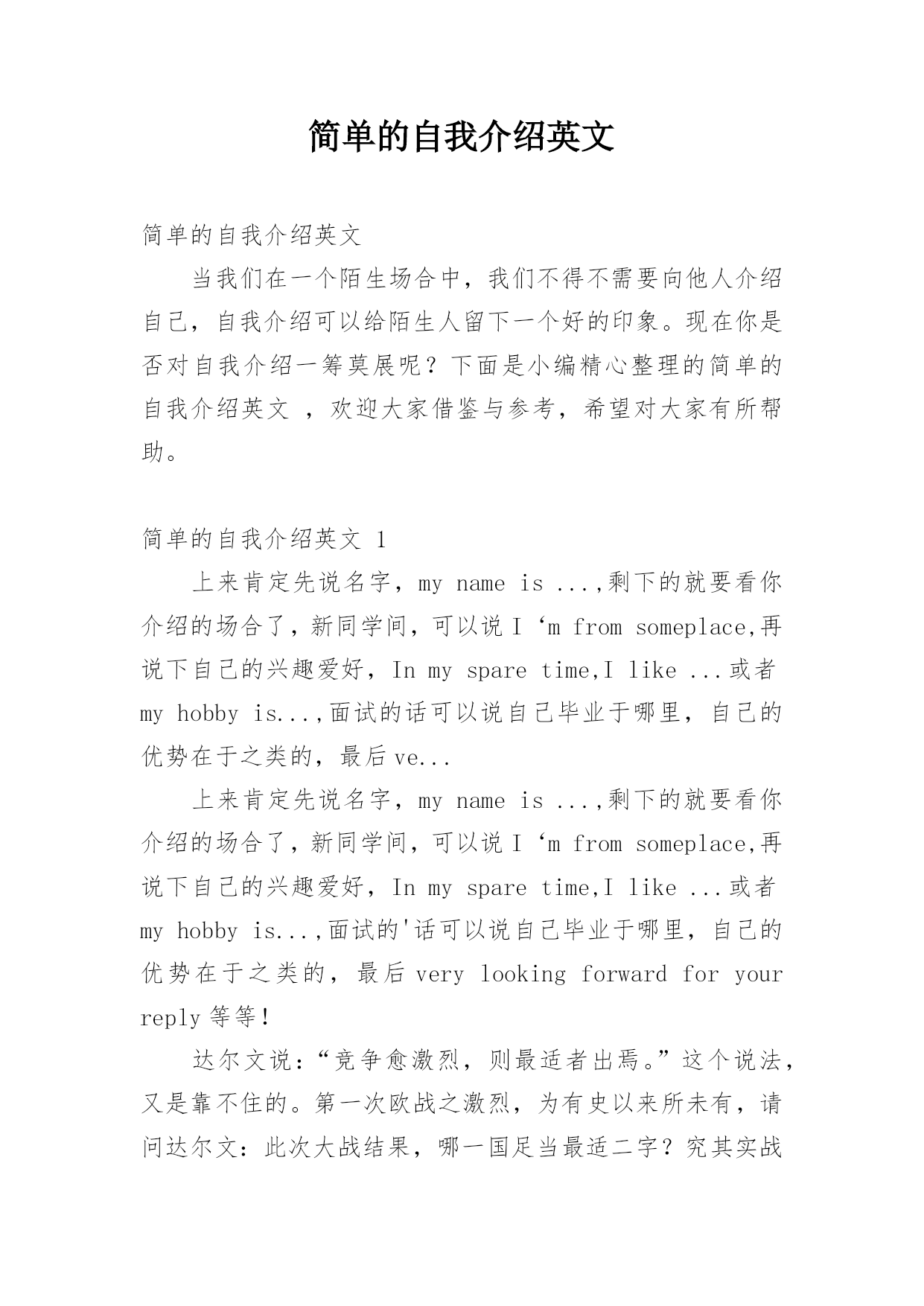 简单的自我介绍英文简单的自我介绍英文当我们在一个陌生场合中,我们不得不需要向他人介绍自己,自我介绍可以给陌生人留下一个好的印象。现在你是否对自我介绍一筹莫展呢?下面是小编精心整理的简单的自我介绍英文,欢迎大家借鉴与参考,希望对大家有所帮助。简单的自我介绍英文1上来肯定先说名字,mynameis...,剩下的就要看你介绍的场合了,新同学间,可以说I‘mfromsomeplace,再说下自己的兴趣爱好,Inmysparetime,Ilike...或者myhobbyis...,面试的话可以说自己毕业于哪里,自己
