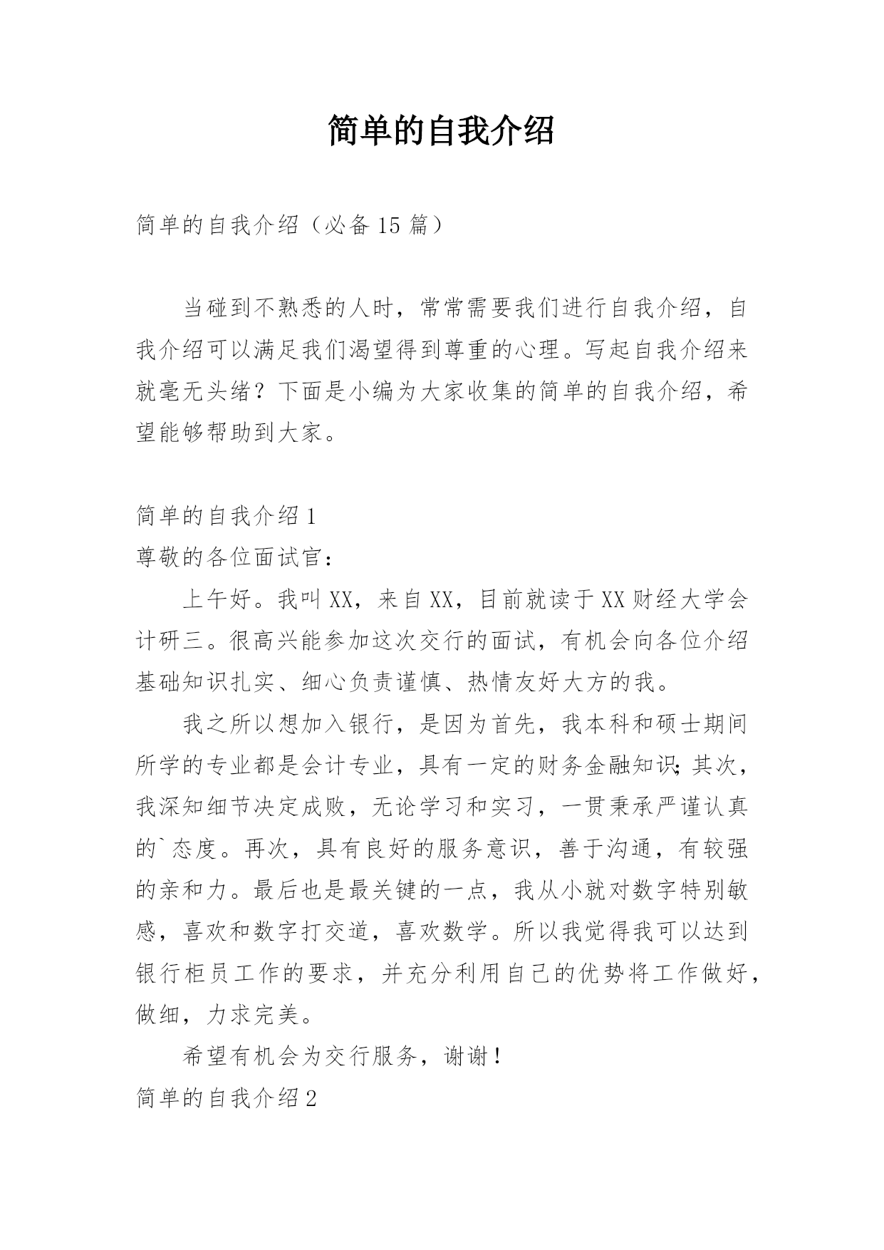 简单的自我介绍简单的自我介绍(必备15篇)当碰到不熟悉的人时,常常需要我们进行自我介绍,自我介绍可以满足我们渴望得到尊重的心理。写起自我介绍来就毫无头绪?下面是小编为大家收集的简单的自我介绍,希望能够帮助到大家。简单的自我介绍1尊敬的各位面试官:上午好。我叫XX,来自XX,目前就读于XX财经大学会计研三。很高兴能参加这次交行的面试,有机会向各位介绍基础知识扎实、细心负责谨慎、热情友好大方的我。我之所以想加入银行,是因为首先,我本科和硕士期间所学的专业都是会计专业,具有一定的财务金融知识;其次,我深知细节决