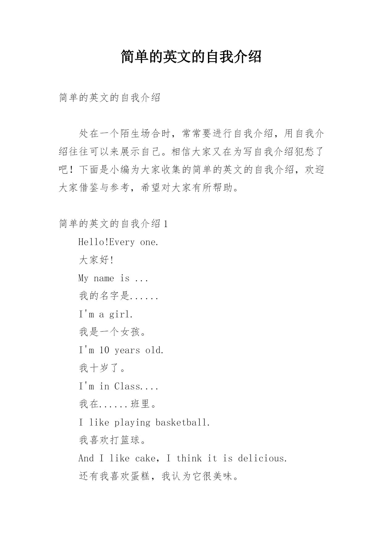 简单的英文的自我介绍简单的英文的自我介绍处在一个陌生场合时,常常要进行自我介绍,用自我介绍往往可以来展示自己。相信大家又在为写自我介绍犯愁了吧!下面是小编为大家收集的简单的英文的自我介绍,欢迎大家借鉴与参考,希望对大家有所帮助。简单的英文的自我介绍1Hello!Everyone.大家好!Mynameis...我的名字是......I'magirl.我是一个女孩。I'm10yearsold.我十岁了。I'minClass....我在......班里。Ilikeplayingbasketball.我喜欢打篮球