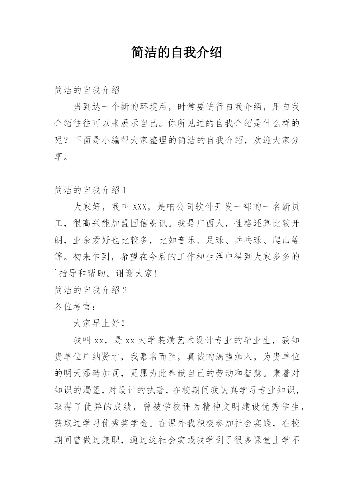简洁的自我介绍简洁的自我介绍当到达一个新的环境后,时常要进行自我介绍,用自我介绍往往可以来展示自己。你所见过的自我介绍是什么样的呢?下面是小编帮大家整理的简洁的自我介绍,欢迎大家分享。简洁的自我介绍1大家好,我叫XXX,是咱公司软件开发一部的一名新员工,很高兴能加盟国信朗讯。我是广西人,性格还算比较开朗,业余爱好也比较多,比如音乐、足球、乒乓球、爬山等等。初来乍到,希望在今后的工作和生活中得到大家多多的`指导和帮助。谢谢大家!简洁的自我介绍2各位考官:大家早上好!我叫xx,是xx大学装潢艺术设计专业的毕业
