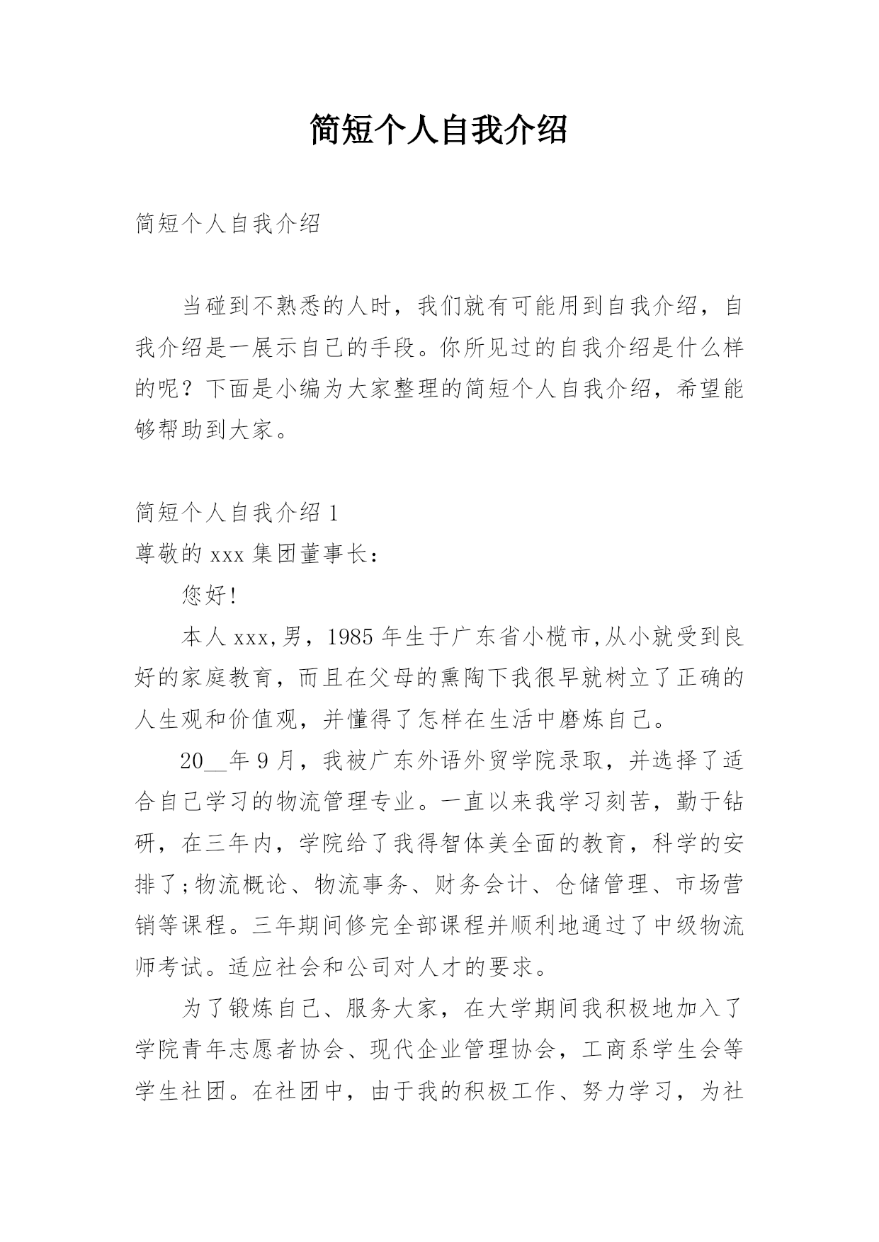 简短个人自我介绍简短个人自我介绍当碰到不熟悉的人时,我们就有可能用到自我介绍,自我介绍是一展示自己的手段。你所见过的自我介绍是什么样的呢?下面是小编为大家整理的简短个人自我介绍,希望能够帮助到大家。简短个人自我介绍1尊敬的xxx集团董事长:您好!本人xxx,男,1985年生于广东省小榄市,从小就受到良好的家庭教育,而且在父母的熏陶下我很早就树立了正确的人生观和价值观,并懂得了怎样在生活中磨炼自己。20__年9月,我被广东外语外贸学院录取,并选择了适合自己学习的物流管理专业。一直以来我学习刻苦,勤于钻研,在