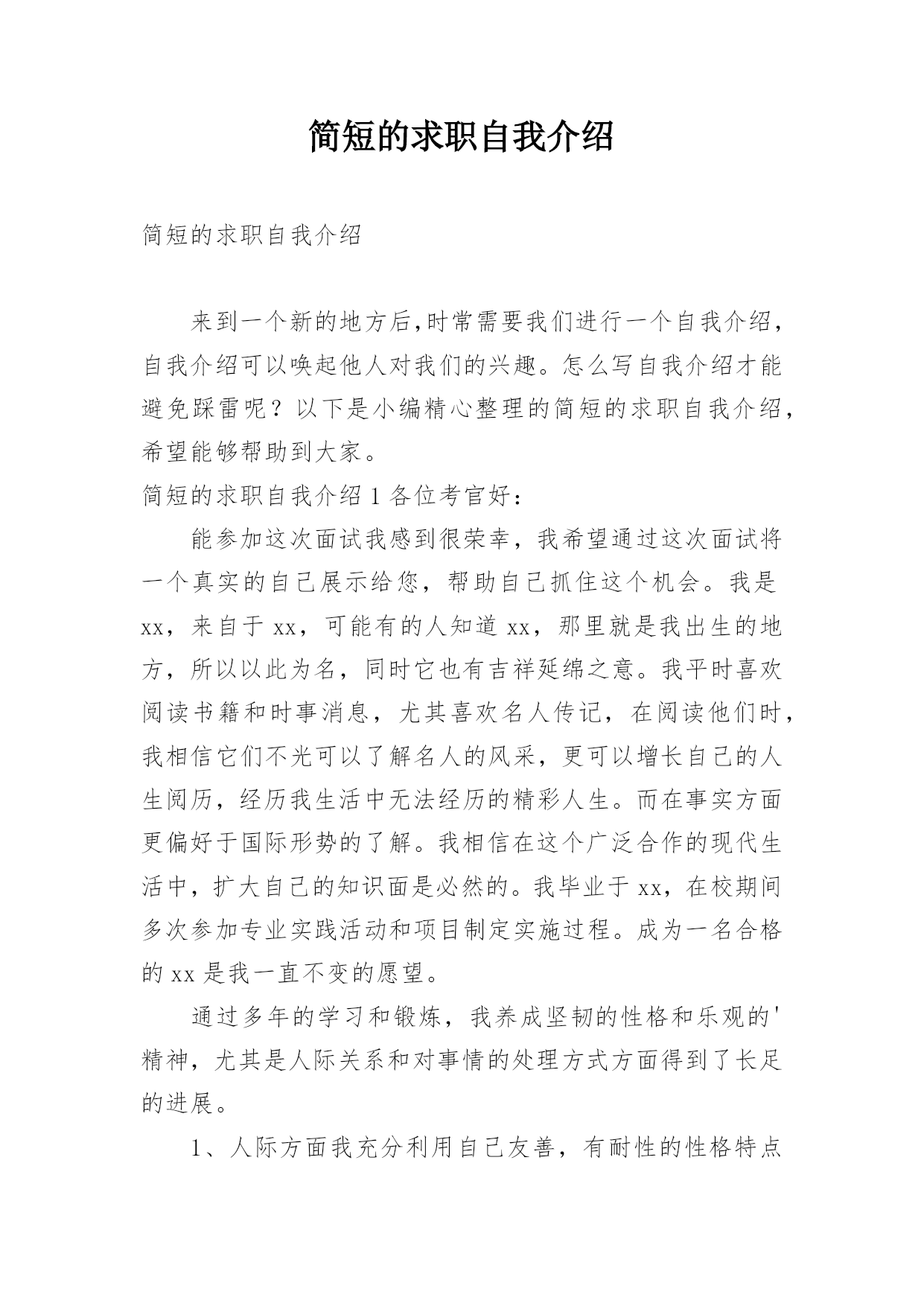 简短的求职自我介绍简短的求职自我介绍来到一个新的地方后,时常需要我们进行一个自我介绍,自我介绍可以唤起他人对我们的兴趣。怎么写自我介绍才能避免踩雷呢?以下是小编精心整理的简短的求职自我介绍,希望能够帮助到大家。简短的求职自我介绍1各位考官好:能参加这次面试我感到很荣幸,我希望通过这次面试将一个真实的自己展示给您,帮助自己抓住这个机会。我是xx,来自于xx,可能有的人知道xx,那里就是我出生的地方,所以以此为名,同时它也有吉祥延绵之意。我平时喜欢阅读书籍和时事消息,尤其喜欢名人传记,在阅读他们时,我相信它们