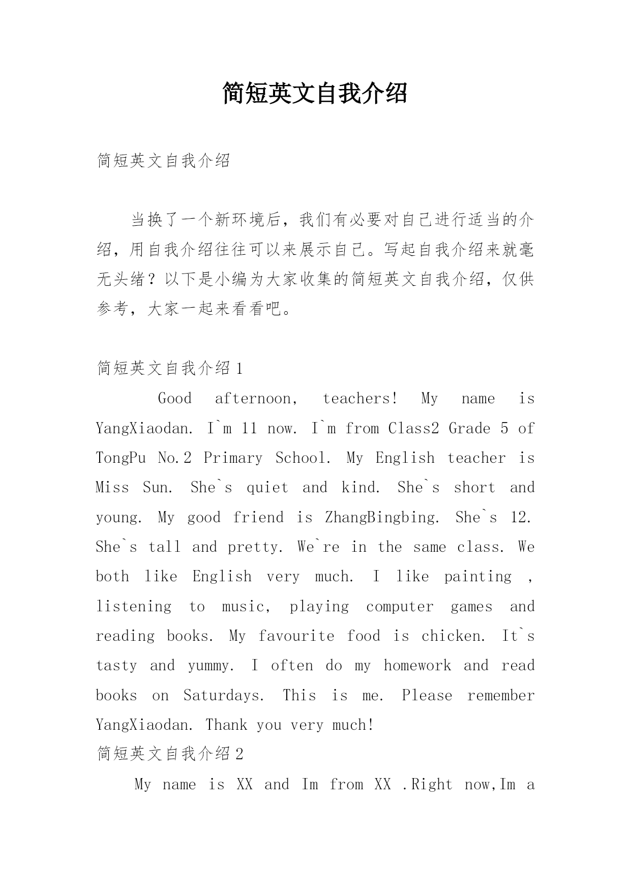 简短英文自我介绍简短英文自我介绍当换了一个新环境后,我们有必要对自己进行适当的介绍,用自我介绍往往可以来展示自己。写起自我介绍来就毫无头绪?以下是小编为大家收集的简短英文自我介绍,仅供参考,大家一起来看看吧。简短英文自我介绍1Goodafternoon,teachers!MynameisYangXiaodan.I`m11now.I`mfromClass2Grade5ofTongPuNo.2PrimarySchool.MyEnglishteacherisMissSun.She`squietandkind.S