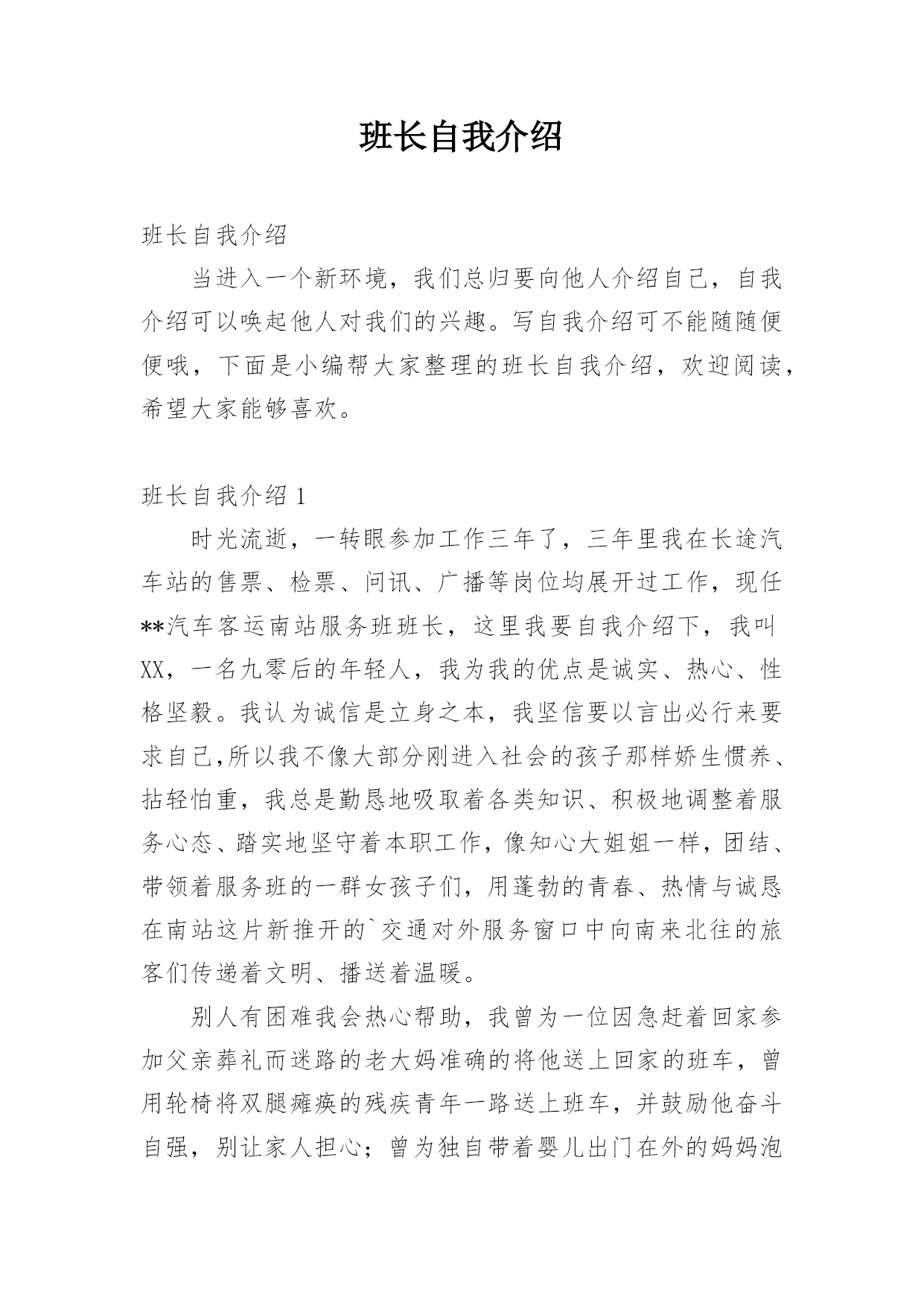 班长自我介绍班长自我介绍当进入一个新环境,我们总归要向他人介绍自己,自我介绍可以唤起他人对我们的兴趣。写自我介绍可不能随随便便哦,下面是小编帮大家整理的班长自我介绍,欢迎阅读,希望大家能够喜欢。班长自我介绍1时光流逝,一转眼参加工作三年了,三年里我在长途汽车站的售票、检票、问讯、广播等岗位均展开过工作,现任**汽车客运南站服务班班长,这里我要自我介绍下,我叫XX,一名九零后的年轻人,我为我的优点是诚实、热心、性格坚毅。我认为诚信是立身之本,我坚信要以言出必行来要求自己,所以我不像大部分刚进入社会的孩子那样