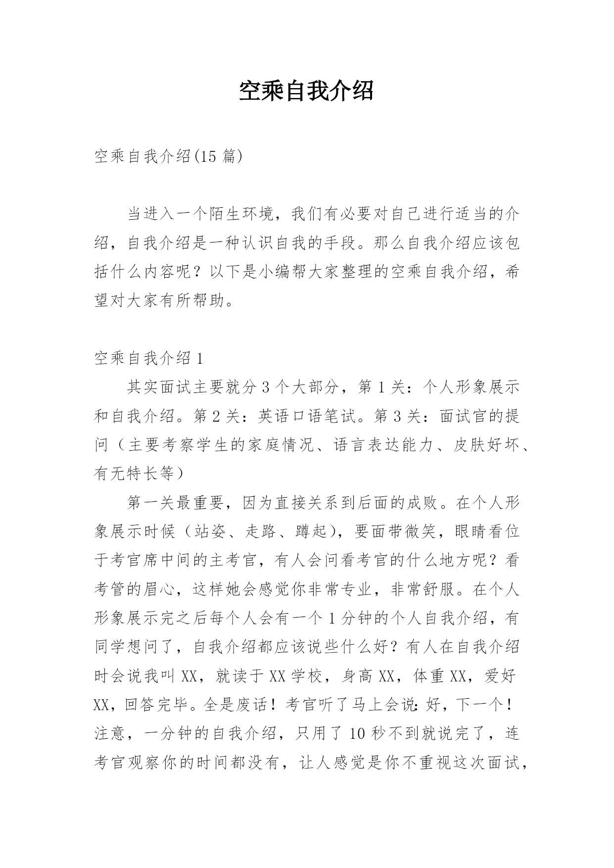 空乘自我介绍空乘自我介绍(15篇)当进入一个陌生环境,我们有必要对自己进行适当的介绍,自我介绍是一种认识自我的手段。那么自我介绍应该包括什么内容呢?以下是小编帮大家整理的空乘自我介绍,希望对大家有所帮助。空乘自我介绍1其实面试主要就分3个大部分,第1关:个人形象展示和自我介绍。第2关:英语口语笔试。第3关:面试官的提问(主要考察学生的家庭情况、语言表达能力、皮肤好坏、有无特长等)第一关最重要,因为直接关系到后面的成败。在个人形象展示时候(站姿、走路、蹲起),要面带微笑,眼睛看位于考官席中间的主考官,有人会