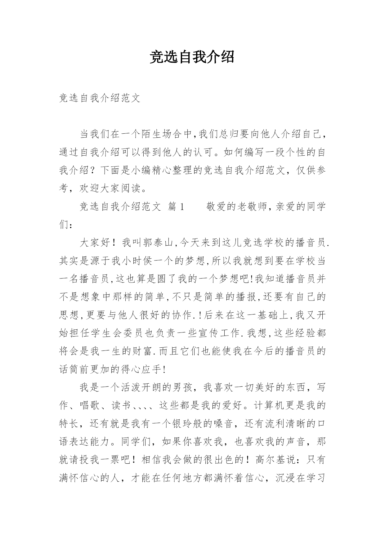 竞选自我介绍竞选自我介绍范文当我们在一个陌生场合中,我们总归要向他人介绍自己,通过自我介绍可以得到他人的认可。如何编写一段个性的自我介绍?下面是小编精心整理的竞选自我介绍范文,仅供参考,欢迎大家阅读。竞选自我介绍范文篇1敬爱的老敬师,亲爱的同学们:大家好!我叫郭泰山,今天来到这儿竞选学校的播音员.其实是源于我小时侯一个的梦想,所以我就想到要在学校当一名播音员,这也算是圆了我的一个梦想吧!我知道播音员并不是想象中那样的简单,不只是简单的播报,还要有自己的思想,更要与他人很好的协作.!后来在这一基础上,我又开