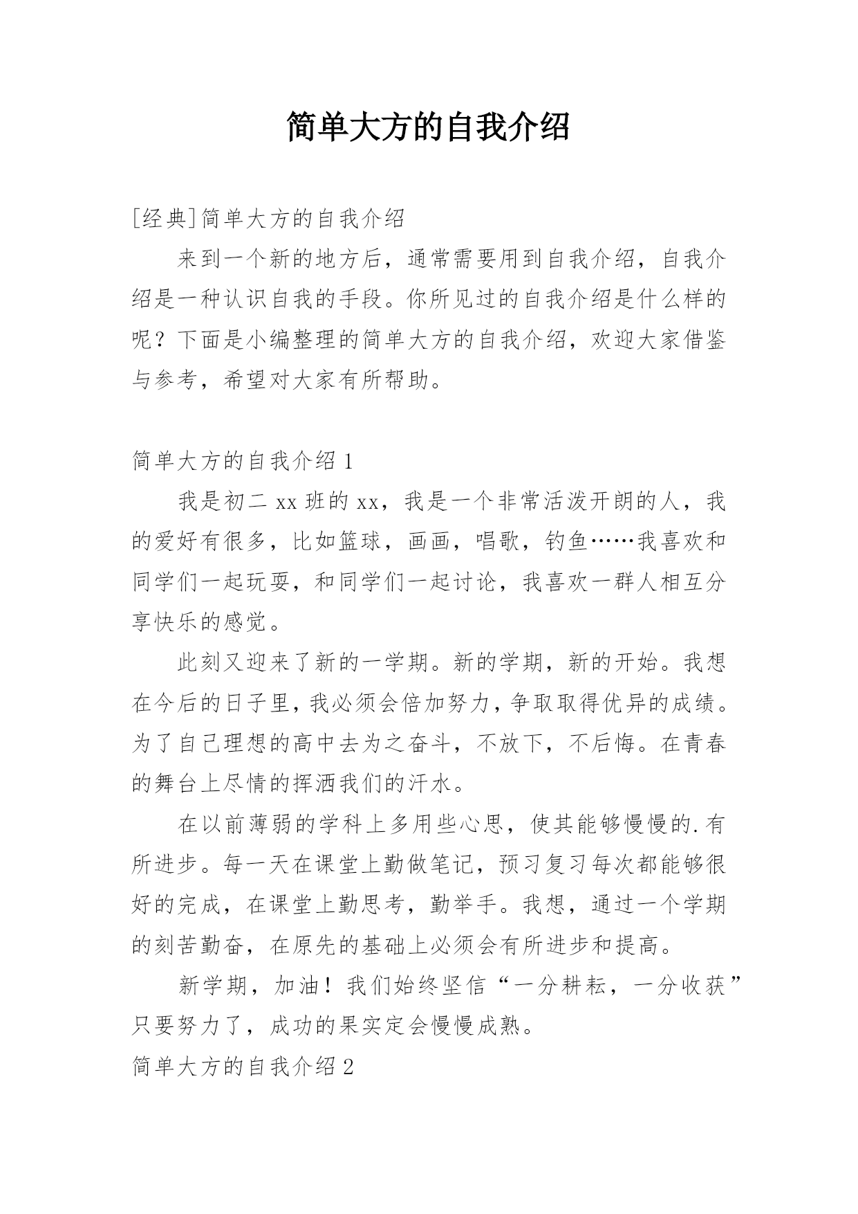 简单大方的自我介绍[经典]简单大方的自我介绍来到一个新的地方后,通常需要用到自我介绍,自我介绍是一种认识自我的手段。你所见过的自我介绍是什么样的呢?下面是小编整理的简单大方的自我介绍,欢迎大家借鉴与参考,希望对大家有所帮助。简单大方的自我介绍1我是初二xx班的xx,我是一个非常活泼开朗的人,我的爱好有很多,比如篮球,画画,唱歌,钓鱼……我喜欢和同学们一起玩耍,和同学们一起讨论,我喜欢一群人相互分享快乐的感觉。此刻又迎来了新的一学期。新的学期,新的开始。我想在今后的日子里,我必须会倍加努力,争取取得优异的成