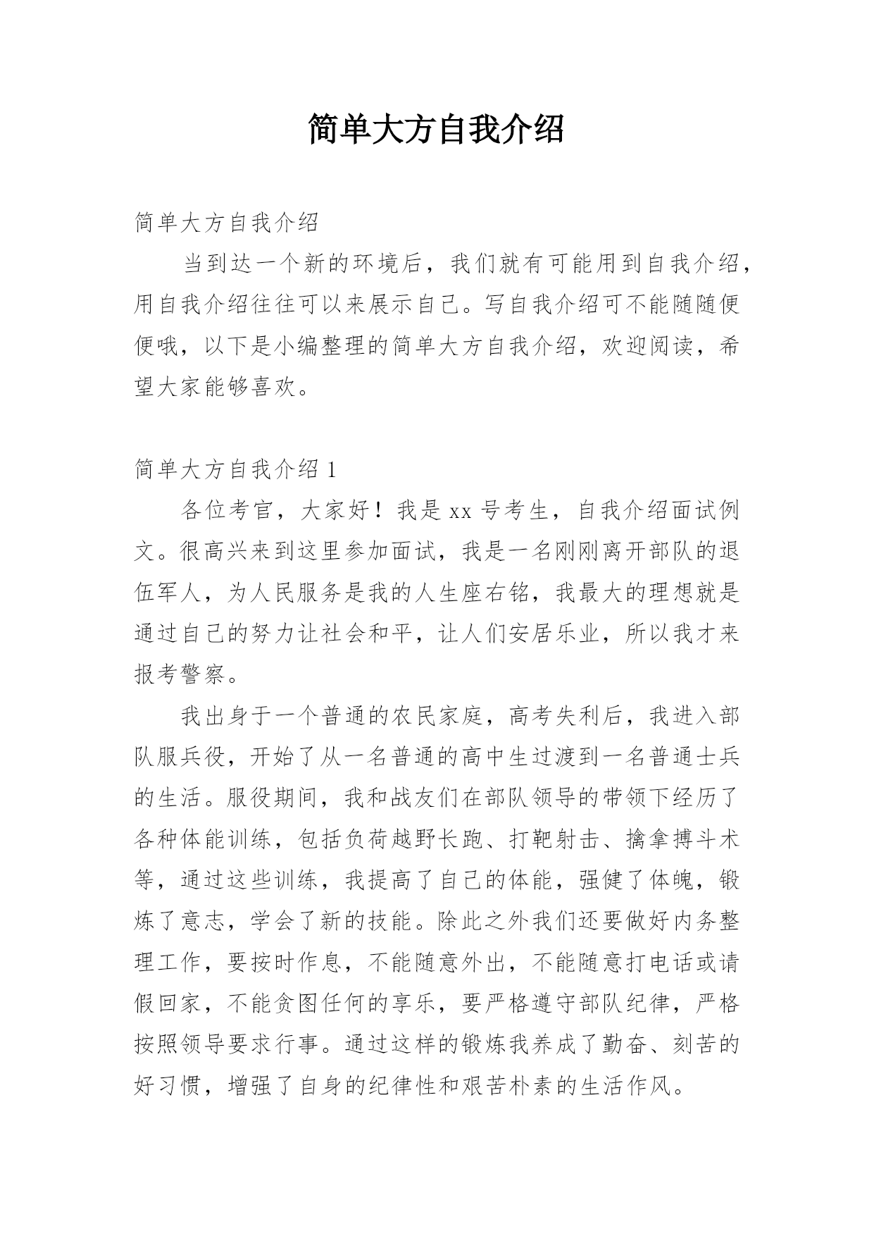 简单大方自我介绍简单大方自我介绍当到达一个新的环境后,我们就有可能用到自我介绍,用自我介绍往往可以来展示自己。写自我介绍可不能随随便便哦,以下是小编整理的简单大方自我介绍,欢迎阅读,希望大家能够喜欢。简单大方自我介绍1各位考官,大家好!我是xx号考生,自我介绍面试例文。很高兴来到这里参加面试,我是一名刚刚离开部队的退伍军人,为人民服务是我的人生座右铭,我最大的理想就是通过自己的努力让社会和平,让人们安居乐业,所以我才来报考警察。我出身于一个普通的农民家庭,高考失利后,我进入部队服兵役,开始了从一名普通的高