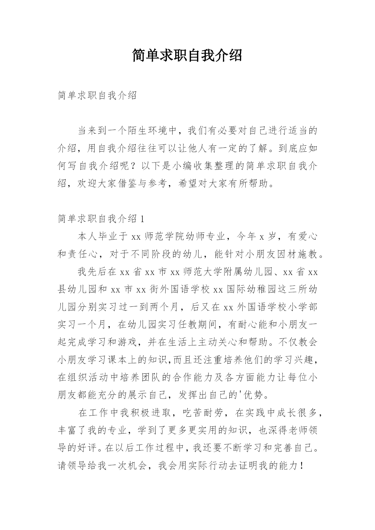 简单求职自我介绍简单求职自我介绍当来到一个陌生环境中,我们有必要对自己进行适当的介绍,用自我介绍往往可以让他人有一定的了解。到底应如何写自我介绍呢?以下是小编收集整理的简单求职自我介绍,欢迎大家借鉴与参考,希望对大家有所帮助。简单求职自我介绍1本人毕业于xx师范学院幼师专业,今年x岁,有爱心和责任心,对于不同阶段的幼儿,能针对小朋友因材施教。我先后在xx省xx市xx师范大学附属幼儿园、xx省xx县幼儿园和xx市xx街外国语学校xx国际幼稚园这三所幼儿园分别实习过一到两个月,后又在xx外国语学校小学部实习一