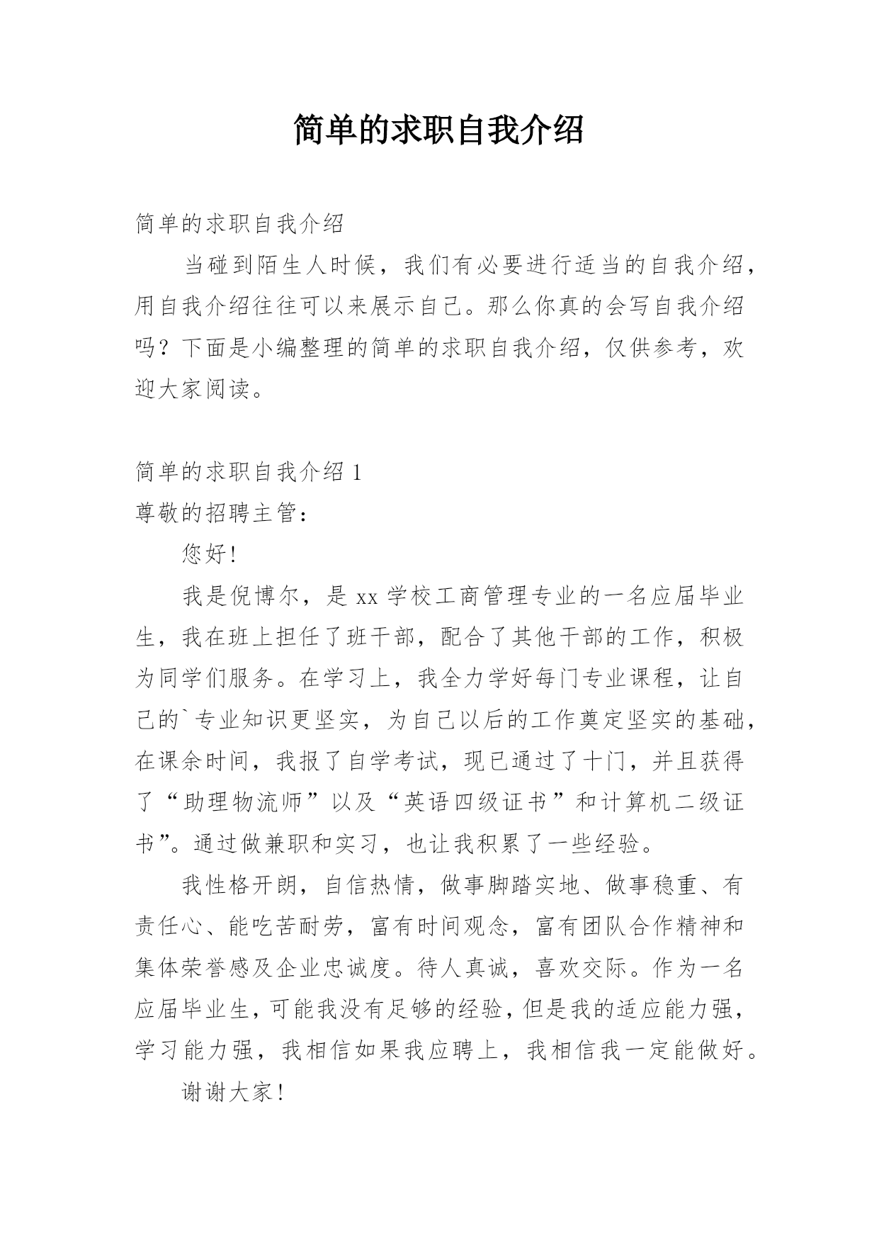 简单的求职自我介绍简单的求职自我介绍当碰到陌生人时候,我们有必要进行适当的自我介绍,用自我介绍往往可以来展示自己。那么你真的会写自我介绍吗?下面是小编整理的简单的求职自我介绍,仅供参考,欢迎大家阅读。简单的求职自我介绍1尊敬的招聘主管:您好!我是倪博尔,是xx学校工商管理专业的一名应届毕业生,我在班上担任了班干部,配合了其他干部的工作,积极为同学们服务。在学习上,我全力学好每门专业课程,让自己的`专业知识更坚实,为自己以后的工作奠定坚实的基础,在课余时间,我报了自学考试,现已通过了十门,并且获得了“助理物