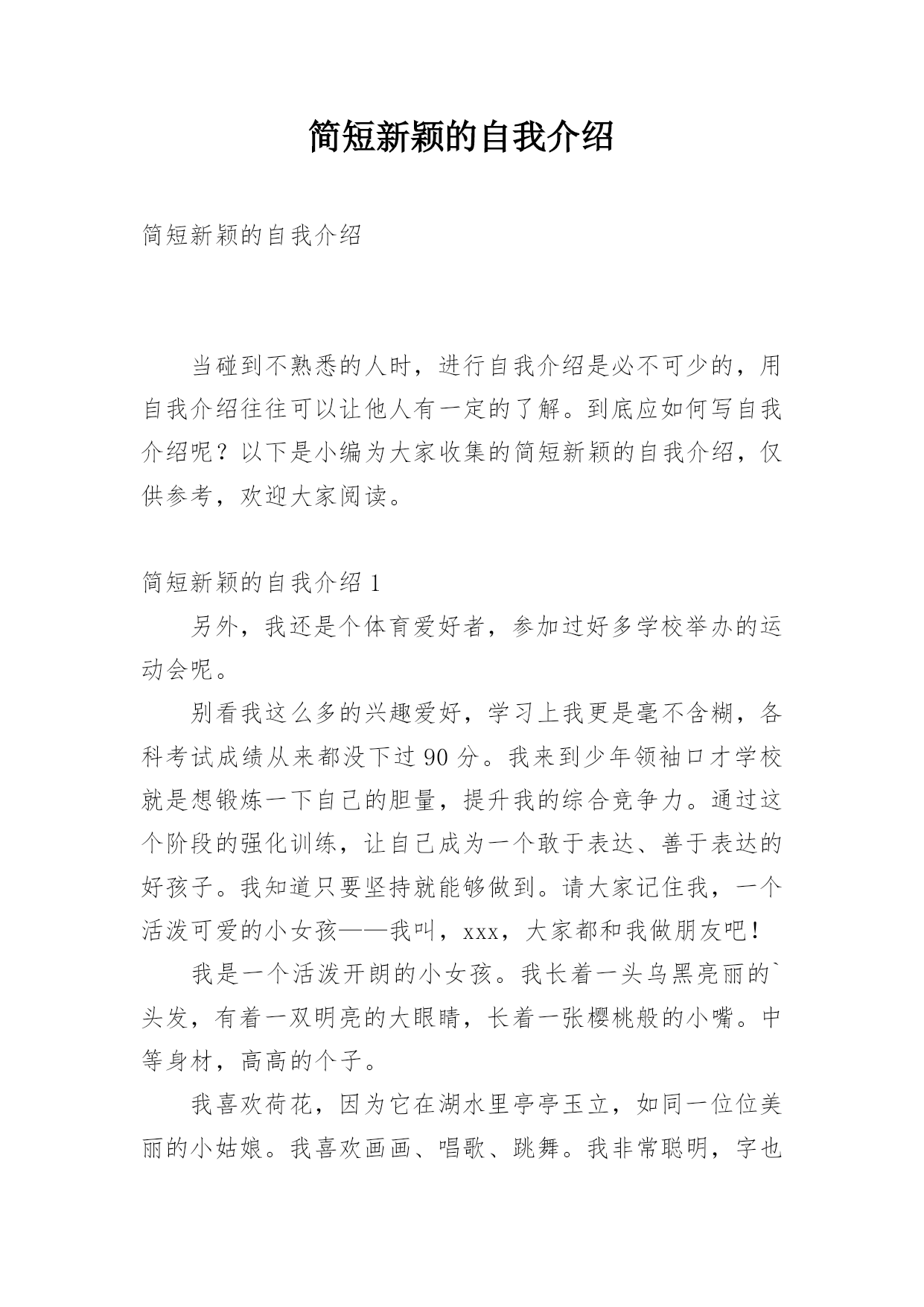 简短新颖的自我介绍简短新颖的自我介绍当碰到不熟悉的人时,进行自我介绍是必不可少的,用自我介绍往往可以让他人有一定的了解。到底应如何写自我介绍呢?以下是小编为大家收集的简短新颖的自我介绍,仅供参考,欢迎大家阅读。简短新颖的自我介绍1另外,我还是个体育爱好者,参加过好多学校举办的运动会呢。别看我这么多的兴趣爱好,学习上我更是毫不含糊,各科考试成绩从来都没下过90分。我来到少年领袖口才学校就是想锻炼一下自己的胆量,提升我的综合竞争力。通过这个阶段的强化训练,让自己成为一个敢于表达、善于表达的好孩子。我知道只要坚