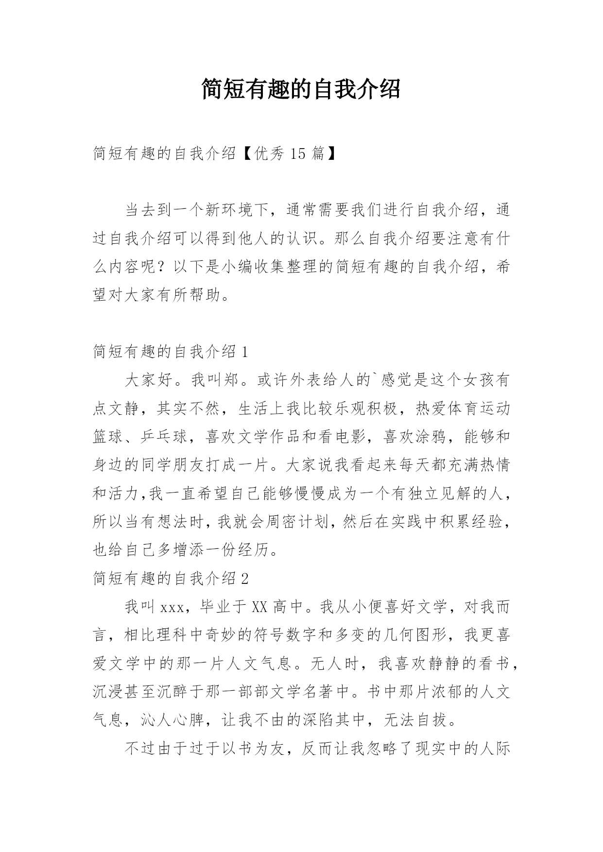 简短有趣的自我介绍简短有趣的自我介绍【优秀15篇】当去到一个新环境下,通常需要我们进行自我介绍,通过自我介绍可以得到他人的认识。那么自我介绍要注意有什么内容呢?以下是小编收集整理的简短有趣的自我介绍,希望对大家有所帮助。简短有趣的自我介绍1大家好。我叫郑。或许外表给人的`感觉是这个女孩有点文静,其实不然,生活上我比较乐观积极,热爱体育运动篮球、乒乓球,喜欢文学作品和看电影,喜欢涂鸦,能够和身边的同学朋友打成一片。大家说我看起来每天都充满热情和活力,我一直希望自己能够慢慢成为一个有独立见解的人,所以当有想法