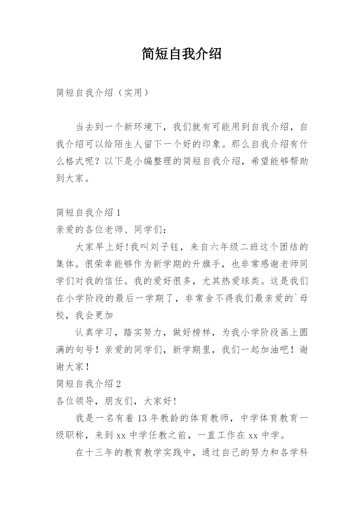 简短自我介绍简短自我介绍(实用)当去到一个新环境下,我们就有可能用到自我介绍,自我介绍可以给陌生人留下一个好的印象。那么自我介绍有什么格式呢?以下是小编整理的简短自我介绍,希望能够帮助到大家。简短自我介绍1亲爱的各位老师、同学们:大家早上好!我叫刘子钰,来自六年级二班这个团结的集体。很荣幸能够作为新学期的升旗手,也非常感谢老师同学们对我的信任。我的爱好很多,尤其热爱球类。这是我们在小学阶段的最后一学期了,非常舍不得我们最亲爱的`母校,我会更加认真学习,踏实努力,做好榜样,为我小学阶段画上圆满的句号!亲爱的