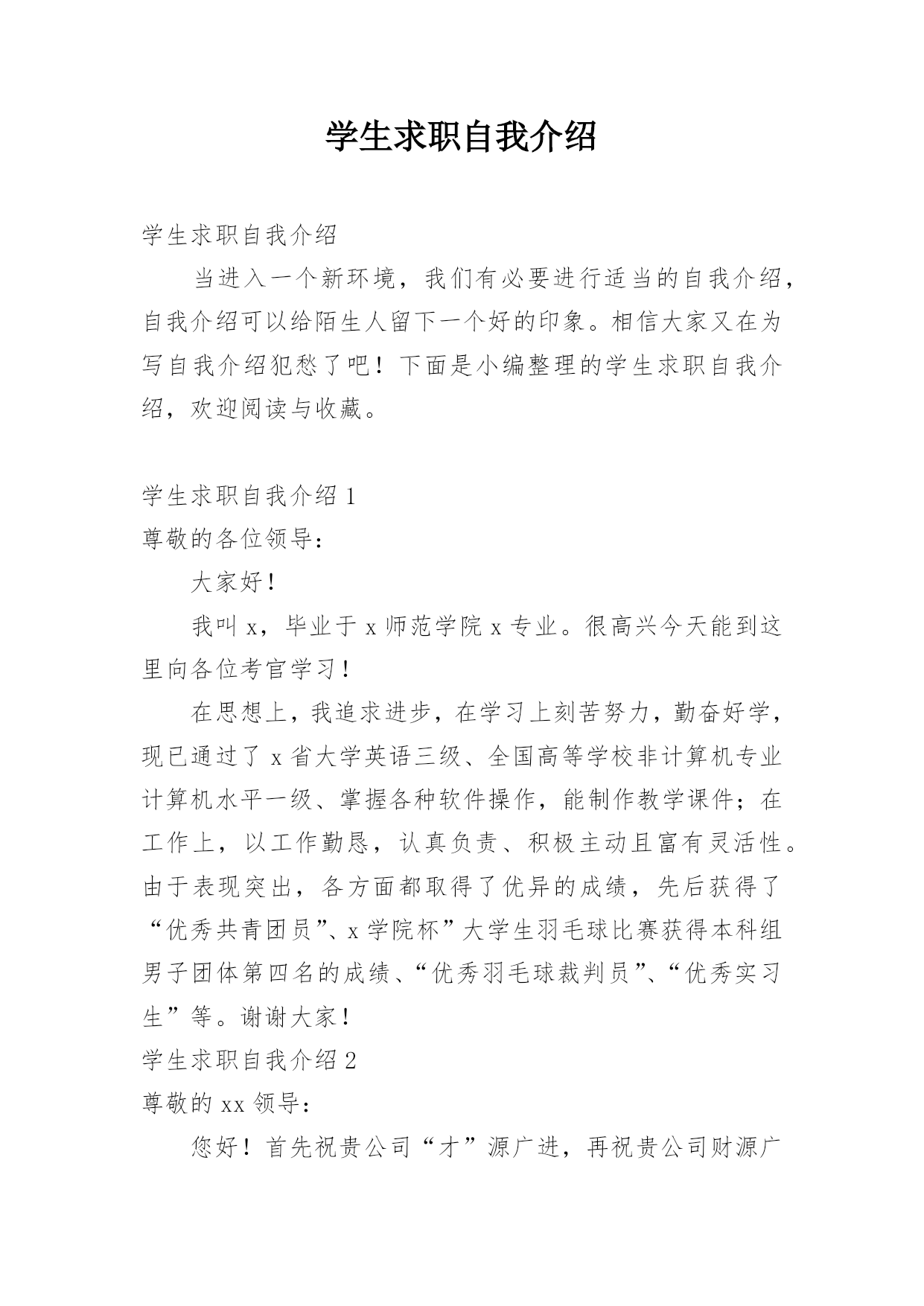 学生求职自我介绍学生求职自我介绍当进入一个新环境,我们有必要进行适当的自我介绍,自我介绍可以给陌生人留下一个好的印象。相信大家又在为写自我介绍犯愁了吧!下面是小编整理的学生求职自我介绍,欢迎阅读与收藏。学生求职自我介绍1尊敬的各位领导:大家好!我叫x,毕业于x师范学院x专业。很高兴今天能到这里向各位考官学习!在思想上,我追求进步,在学习上刻苦努力,勤奋好学,现已通过了x省大学英语三级、全国高等学校非计算机专业计算机水平一级、掌握各种软件操作,能制作教学课件;在工作上,以工作勤恳,认真负责、积极主动且富有灵