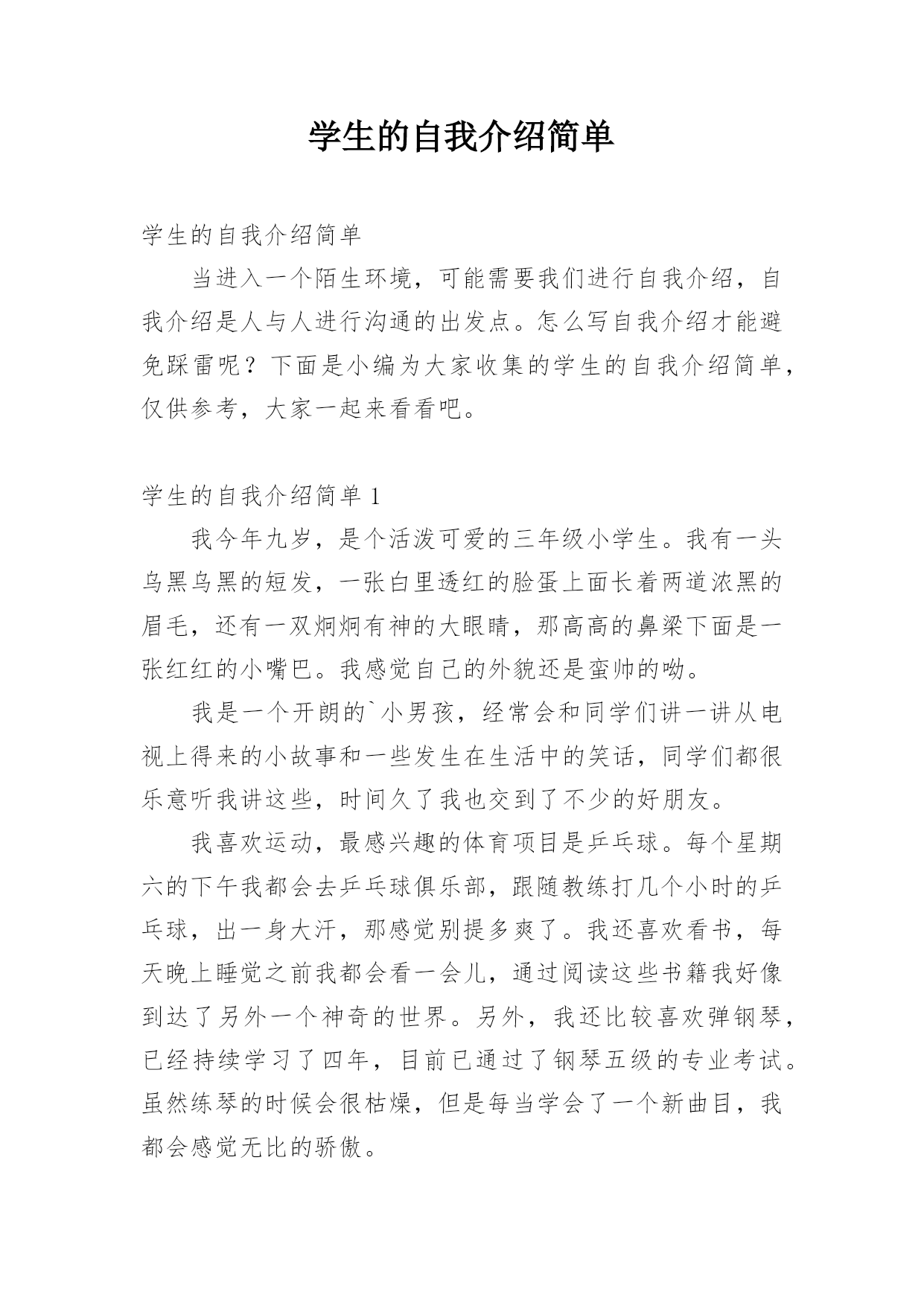 学生的自我介绍简单学生的自我介绍简单当进入一个陌生环境,可能需要我们进行自我介绍,自我介绍是人与人进行沟通的出发点。怎么写自我介绍才能避免踩雷呢?下面是小编为大家收集的学生的自我介绍简单,仅供参考,大家一起来看看吧。学生的自我介绍简单1我今年九岁,是个活泼可爱的三年级小学生。我有一头乌黑乌黑的短发,一张白里透红的脸蛋上面长着两道浓黑的眉毛,还有一双炯炯有神的大眼睛,那高高的鼻梁下面是一张红红的小嘴巴。我感觉自己的外貌还是蛮帅的呦。我是一个开朗的`小男孩,经常会和同学们讲一讲从电视上得来的小故事和一些发生在