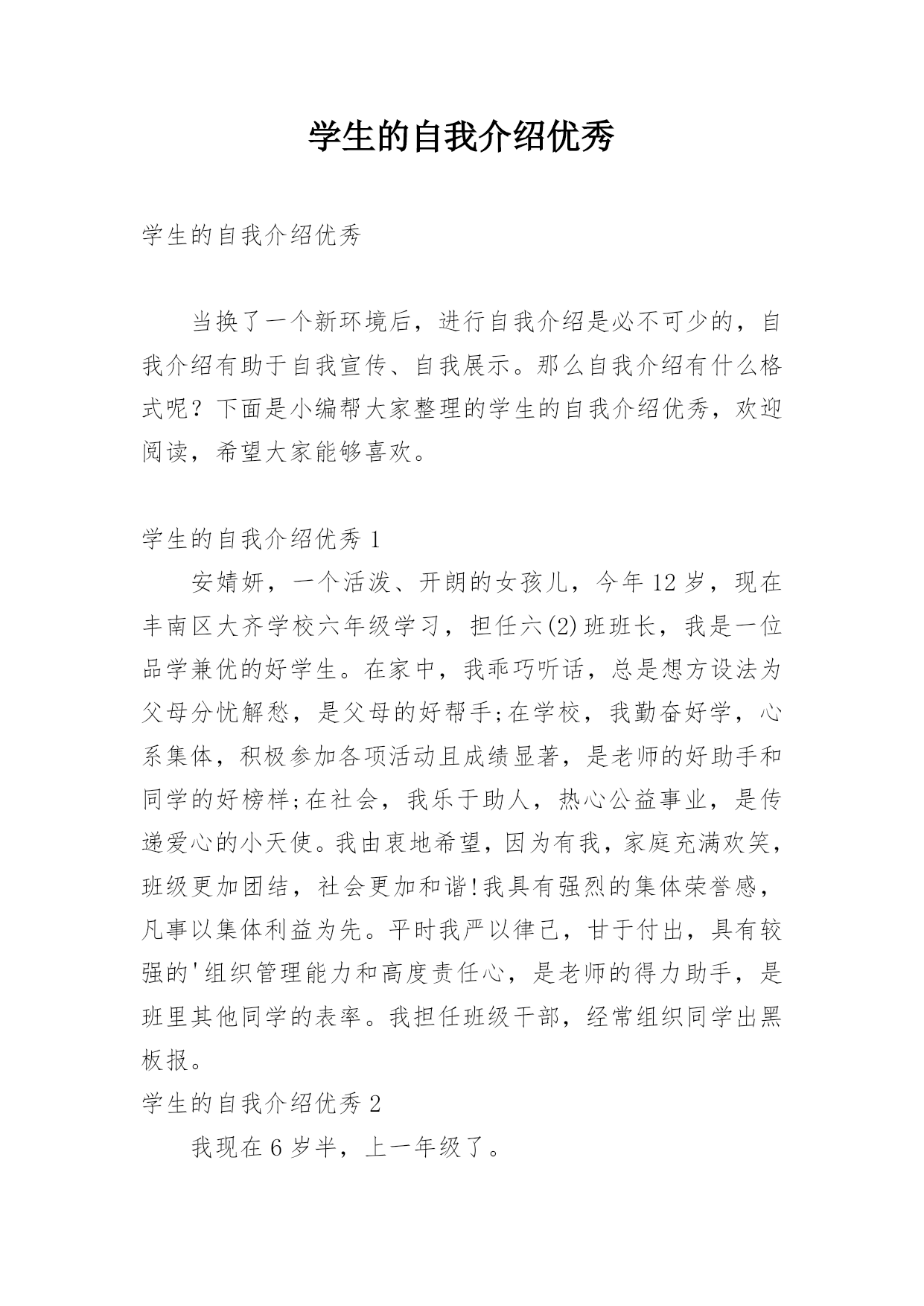 学生的自我介绍优秀学生的自我介绍优秀当换了一个新环境后,进行自我介绍是必不可少的,自我介绍有助于自我宣传、自我展示。那么自我介绍有什么格式呢?下面是小编帮大家整理的学生的自我介绍优秀,欢迎阅读,希望大家能够喜欢。学生的自我介绍优秀1安婧妍,一个活泼、开朗的女孩儿,今年12岁,现在丰南区大齐学校六年级学习,担任六(2)班班长,我是一位品学兼优的好学生。在家中,我乖巧听话,总是想方设法为父母分忧解愁,是父母的好帮手;在学校,我勤奋好学,心系集体,积极参加各项活动且成绩显著,是老师的好助手和同学的好榜样;在社会