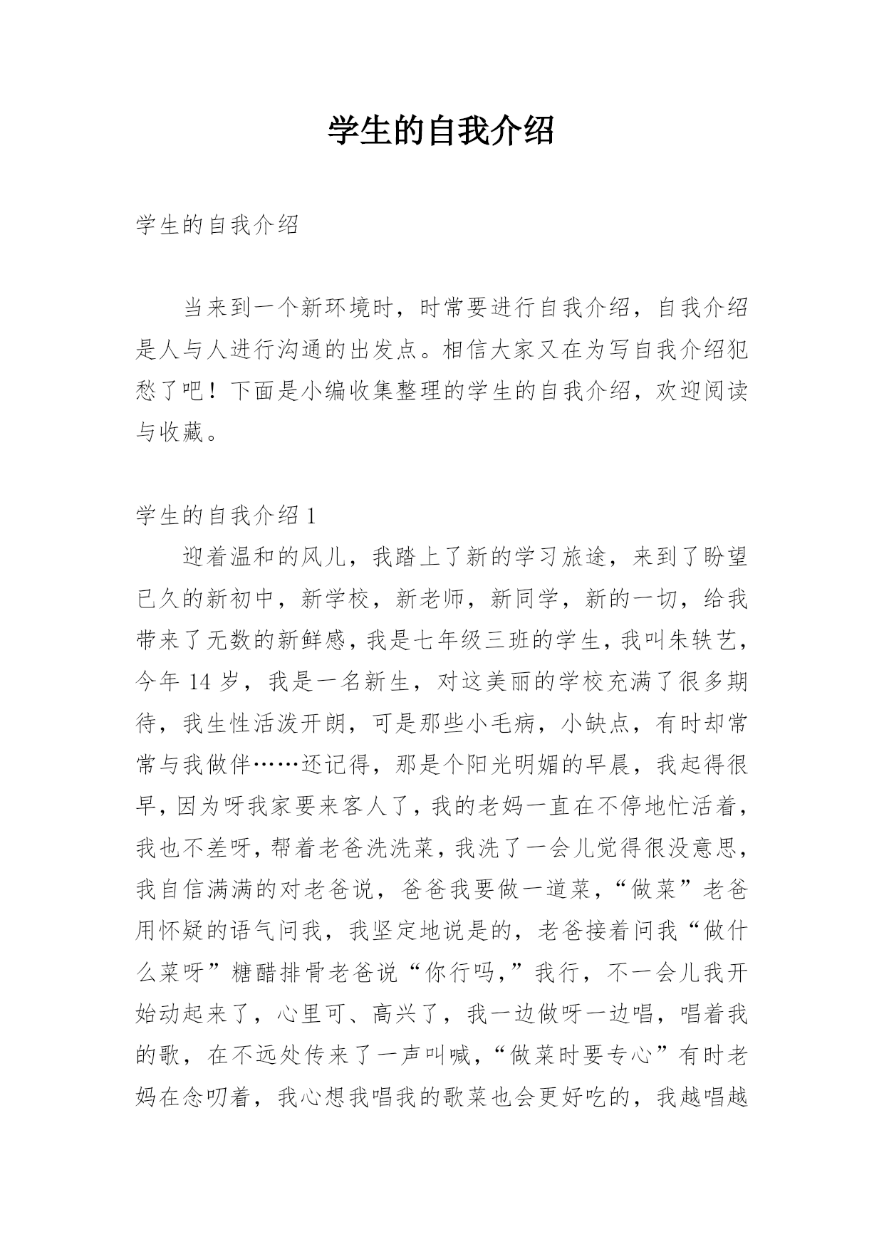 学生的自我介绍学生的自我介绍当来到一个新环境时,时常要进行自我介绍,自我介绍是人与人进行沟通的出发点。相信大家又在为写自我介绍犯愁了吧!下面是小编收集整理的学生的自我介绍,欢迎阅读与收藏。学生的自我介绍1迎着温和的风儿,我踏上了新的学习旅途,来到了盼望已久的新初中,新学校,新老师,新同学,新的一切,给我带来了无数的新鲜感,我是七年级三班的学生,我叫朱轶艺,今年14岁,我是一名新生,对这美丽的学校充满了很多期待,我生性活泼开朗,可是那些小毛病,小缺点,有时却常常与我做伴……还记得,那是个阳光明媚的早晨,我起