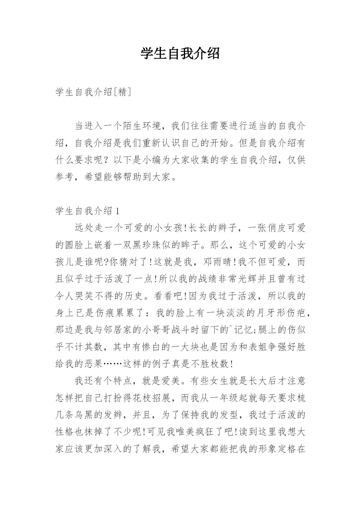 学生自我介绍学生自我介绍[精]当进入一个陌生环境,我们往往需要进行适当的自我介绍,自我介绍是我们重新认识自己的开始。但是自我介绍有什么要求呢?以下是小编为大家收集的学生自我介绍,仅供参考,希望能够帮助到大家。学生自我介绍1远处走一个可爱的小女孩!长长的辫子,一张俏皮可爱的圆脸上嵌着一双黑珍珠似的眸子。那么,这个可爱的小女孩儿是谁呢?你猜对了!这就是我,邓雨晴!我不但可爱,而且似乎过于活泼了一点!所以我的战绩非常光辉并且曾有过令人哭笑不得的历史。看看吧!因为我过于活泼,所以我的身上已是伤痕累累了:我的脸上有