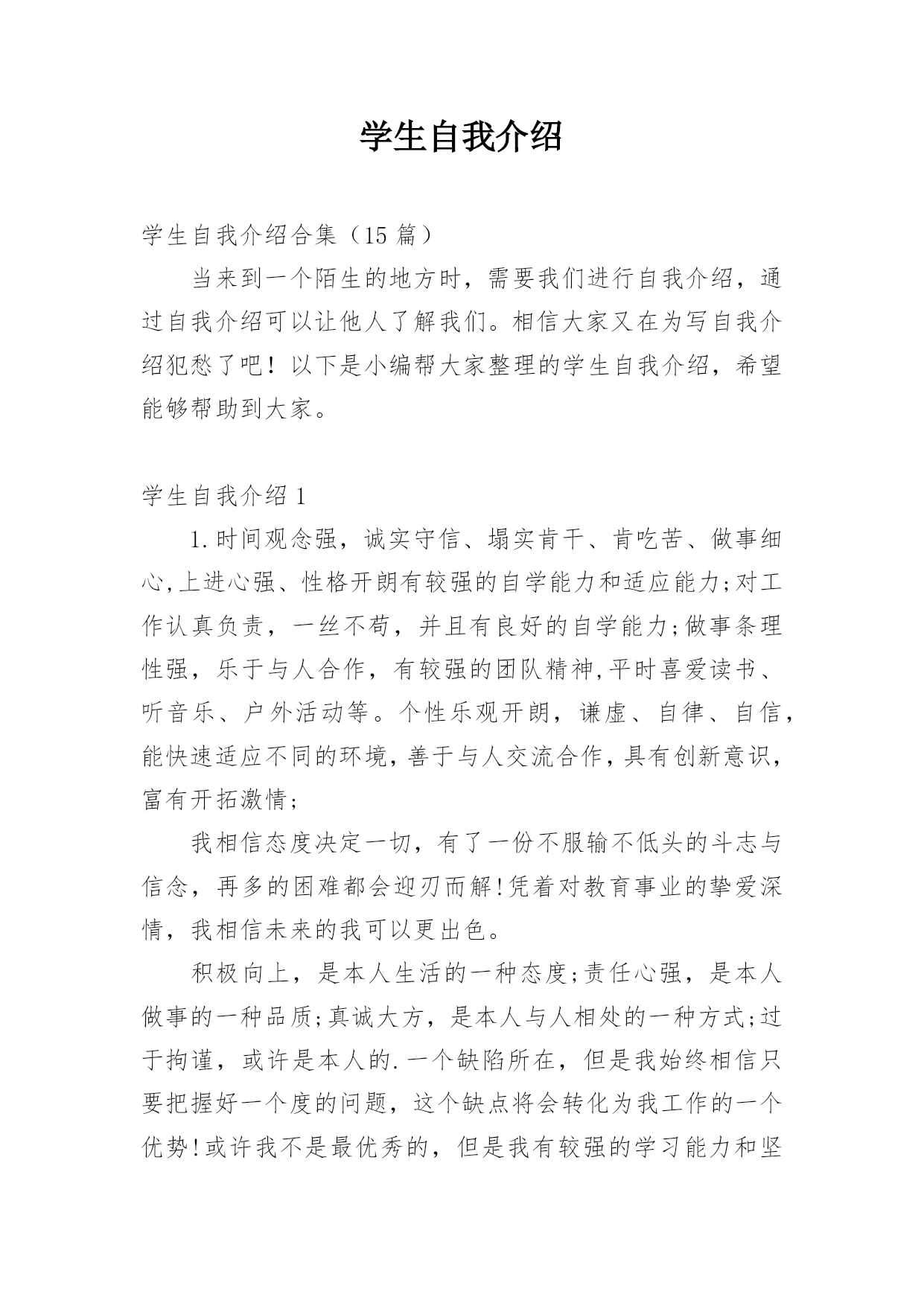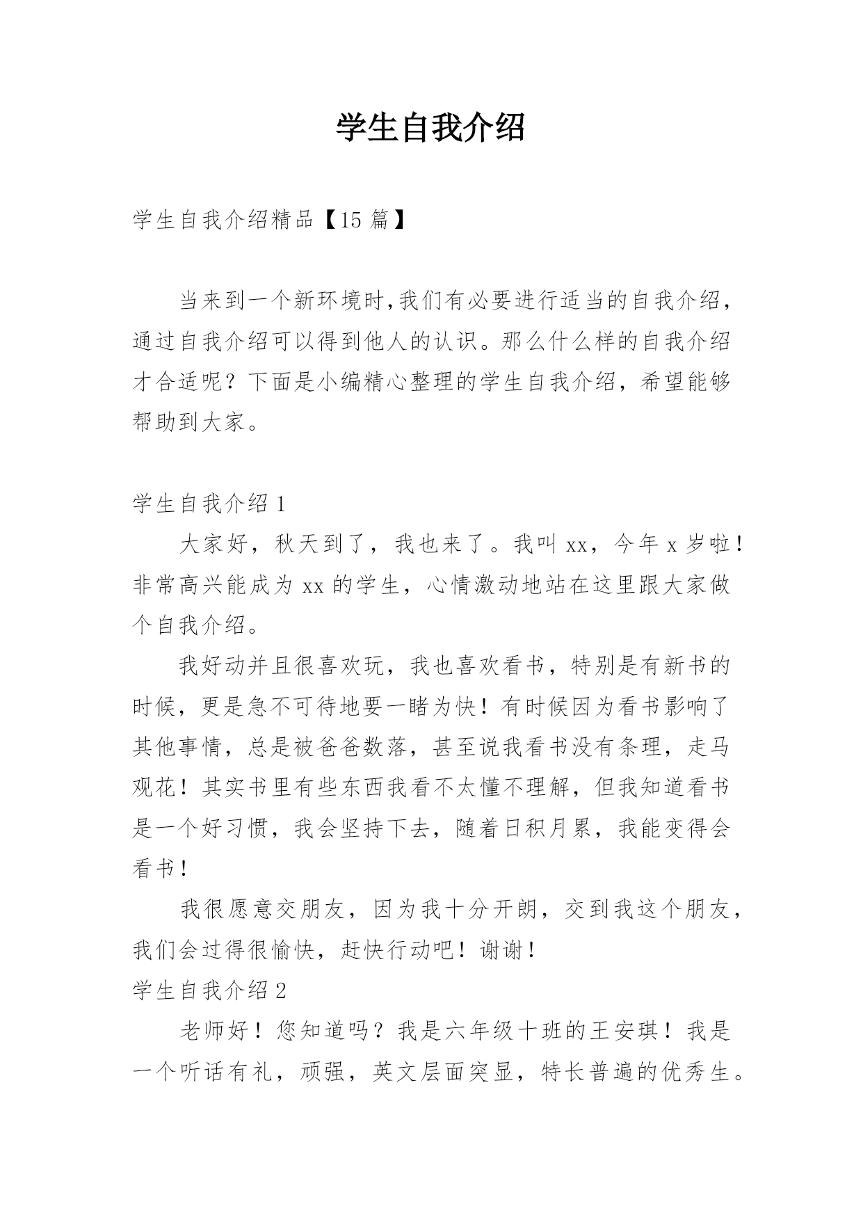 学生自我介绍学生自我介绍精品【15篇】当来到一个新环境时,我们有必要进行适当的自我介绍,通过自我介绍可以得到他人的认识。那么什么样的自我介绍才合适呢?下面是小编精心整理的学生自我介绍,希望能够帮助到大家。学生自我介绍1大家好,秋天到了,我也来了。我叫xx,今年x岁啦!非常高兴能成为xx的学生,心情激动地站在这里跟大家做个自我介绍。我好动并且很喜欢玩,我也喜欢看书,特别是有新书的时候,更是急不可待地要一睹为快!有时候因为看书影响了其他事情,总是被爸爸数落,甚至说我看书没有条理,走马观花!其实书里有些东西我看