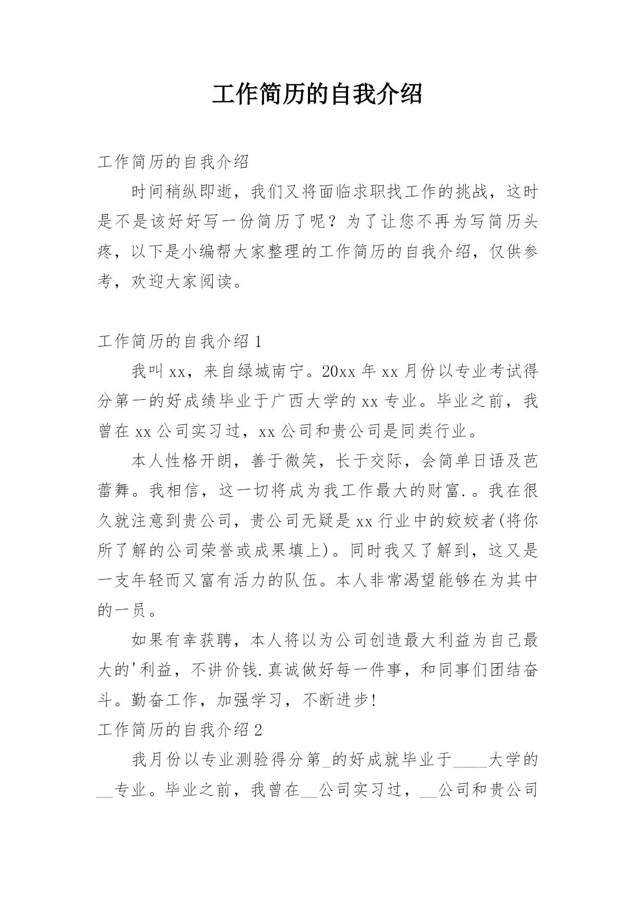 工作简历的自我介绍工作简历的自我介绍时间稍纵即逝,我们又将面临求职找工作的挑战,这时是不是该好好写一份简历了呢?为了让您不再为写简历头疼,以下是小编帮大家整理的工作简历的自我介绍,仅供参考,欢迎大家阅读。工作简历的自我介绍1我叫xx,来自绿城南宁。20xx年xx月份以专业考试得分第一的好成绩毕业于广西大学的xx专业。毕业之前,我曾在xx公司实习过,xx公司和贵公司是同类行业。本人性格开朗,善于微笑,长于交际,会简单日语及芭蕾舞。我相信,这一切将成为我工作最大的财富.。我在很久就注意到贵公司,贵公司无疑是x