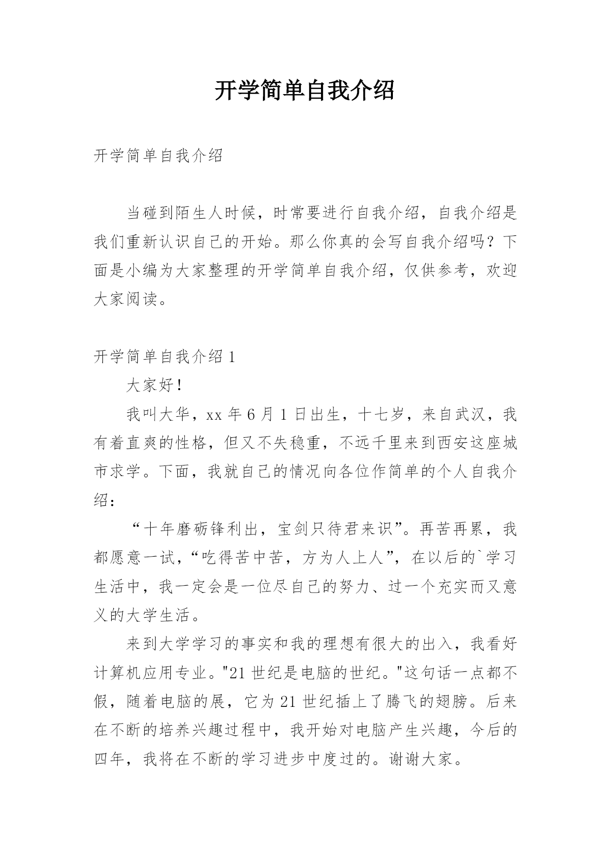 开学简单自我介绍开学简单自我介绍当碰到陌生人时候,时常要进行自我介绍,自我介绍是我们重新认识自己的开始。那么你真的会写自我介绍吗?下面是小编为大家整理的开学简单自我介绍,仅供参考,欢迎大家阅读。开学简单自我介绍1大家好!我叫大华,xx年6月1日出生,十七岁,来自武汉,我有着直爽的性格,但又不失稳重,不远千里来到西安这座城市求学。下面,我就自己的情况向各位作简单的个人自我介绍:“十年磨砺锋利出,宝剑只待君来识”。再苦再累,我都愿意一试,“吃得苦中苦,方为人上人”,在以后的`学习生活中,我一定会是一位尽自己的