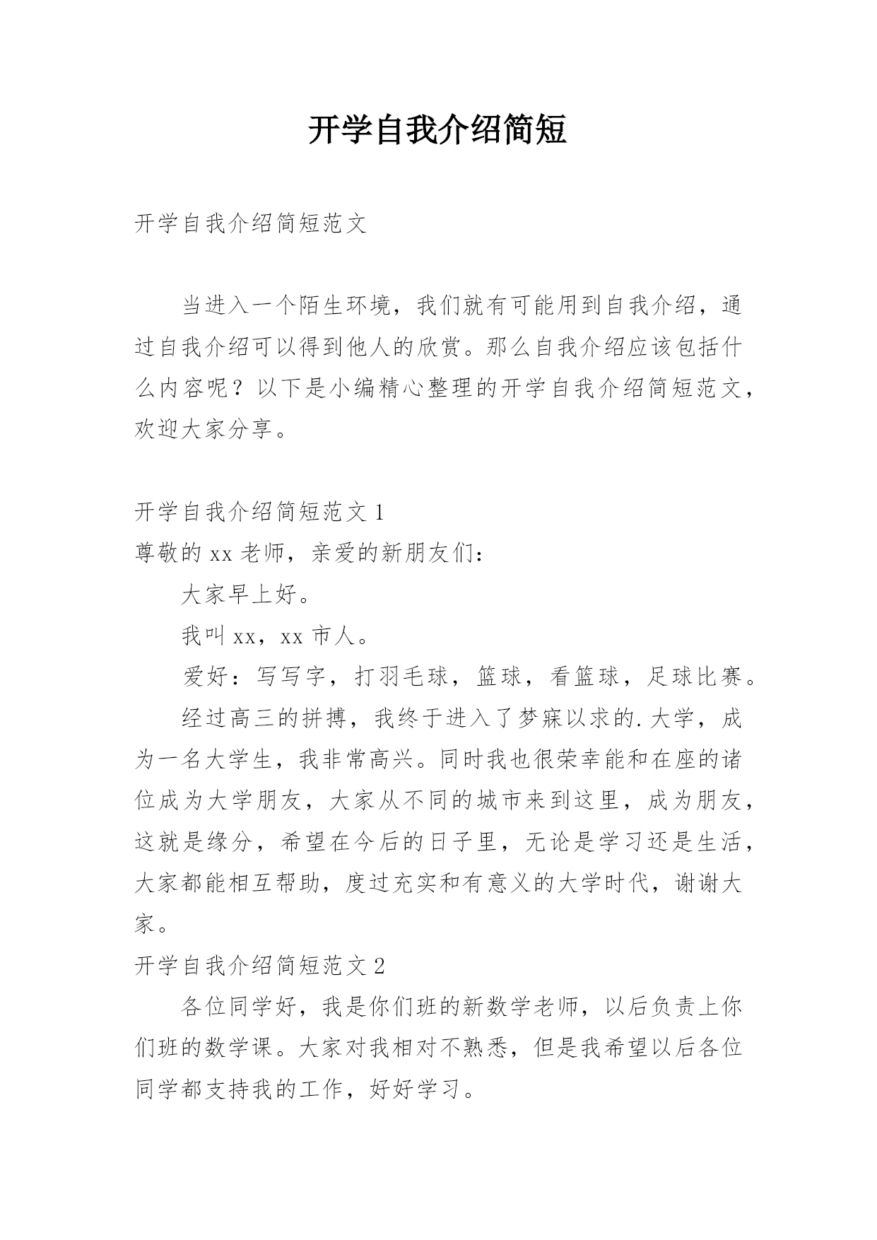 开学自我介绍简短开学自我介绍简短范文当进入一个陌生环境,我们就有可能用到自我介绍,通过自我介绍可以得到他人的欣赏。那么自我介绍应该包括什么内容呢?以下是小编精心整理的开学自我介绍简短范文,欢迎大家分享。开学自我介绍简短范文1尊敬的xx老师,亲爱的新朋友们:大家早上好。我叫xx,xx市人。爱好:写写字,打羽毛球,篮球,看篮球,足球比赛。经过高三的拼搏,我终于进入了梦寐以求的.大学,成为一名大学生,我非常高兴。同时我也很荣幸能和在座的诸位成为大学朋友,大家从不同的城市来到这里,成为朋友,这就是缘分,希望在今后